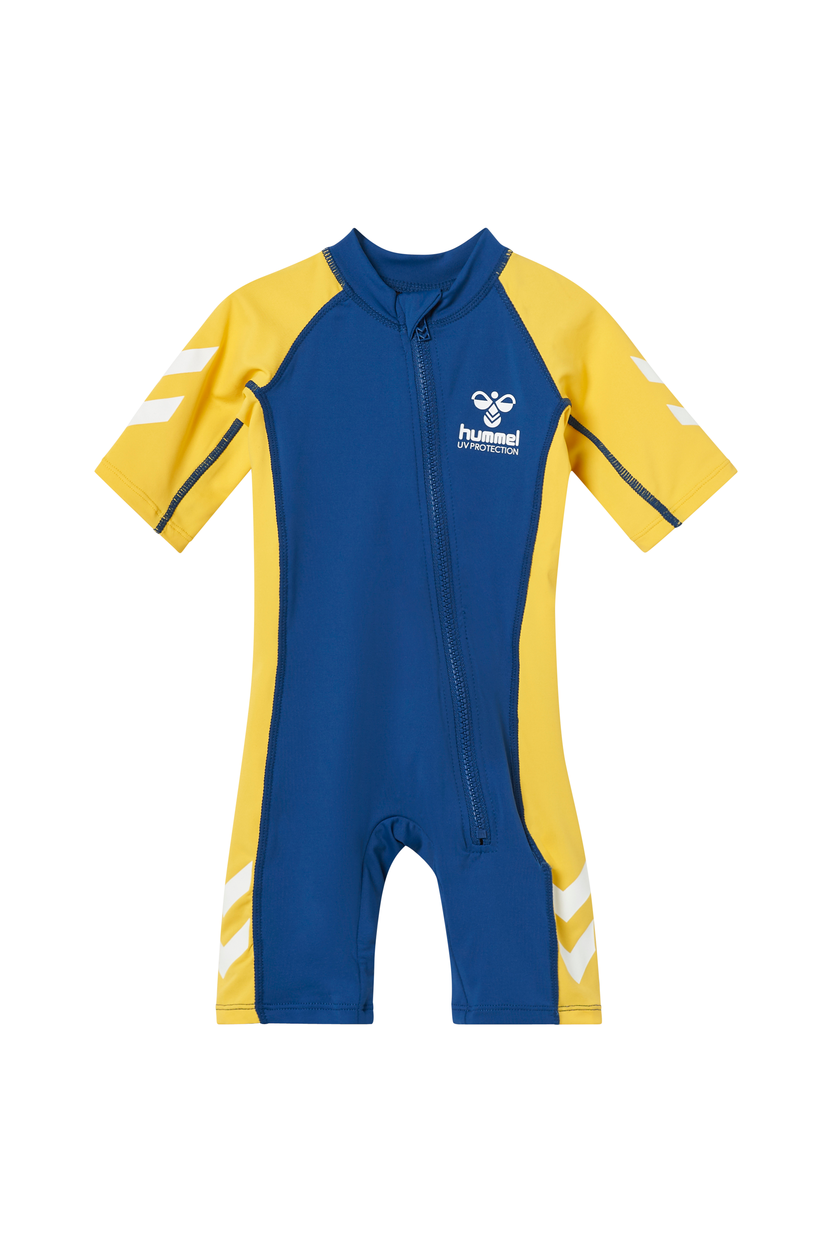 Heldækkende badedragt i stretchmateriale med solbeskyttelsesfaktor 40+. Høj krave og lynlås som går ned på det ene ben.