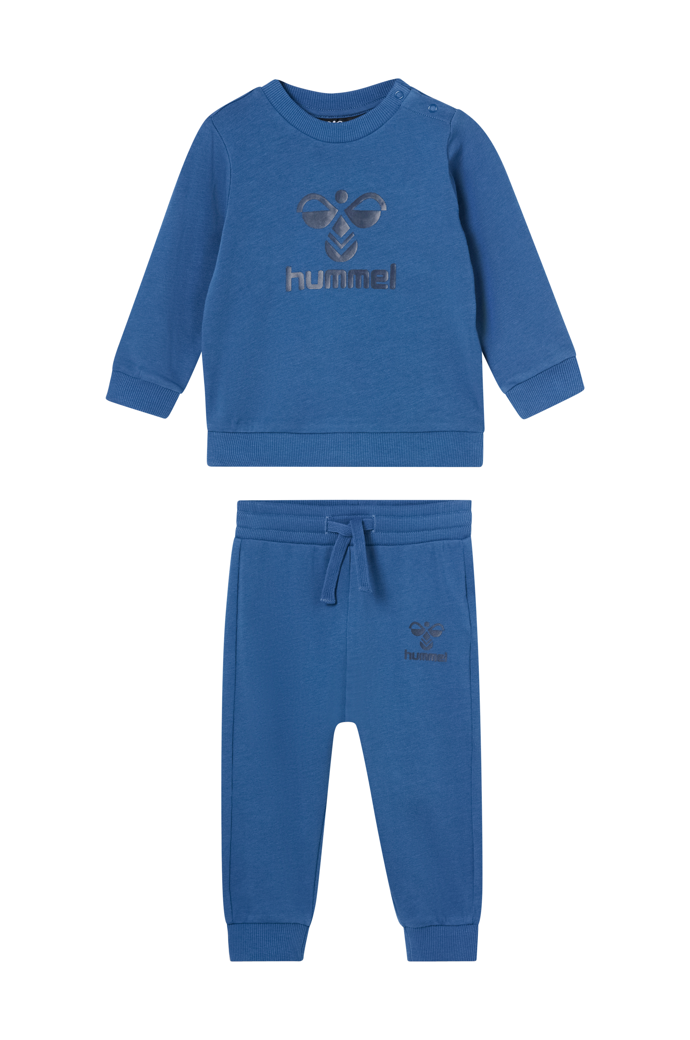 • Sweatshirt med rund halsudskæring og tryk foran• Ribmanchetter ved manchetterne og nederst• Trykknapper på en skulder• Sweatbukser med ribbet, elastisk talje og træksnørre• Ribmanchetter ved enden af benene