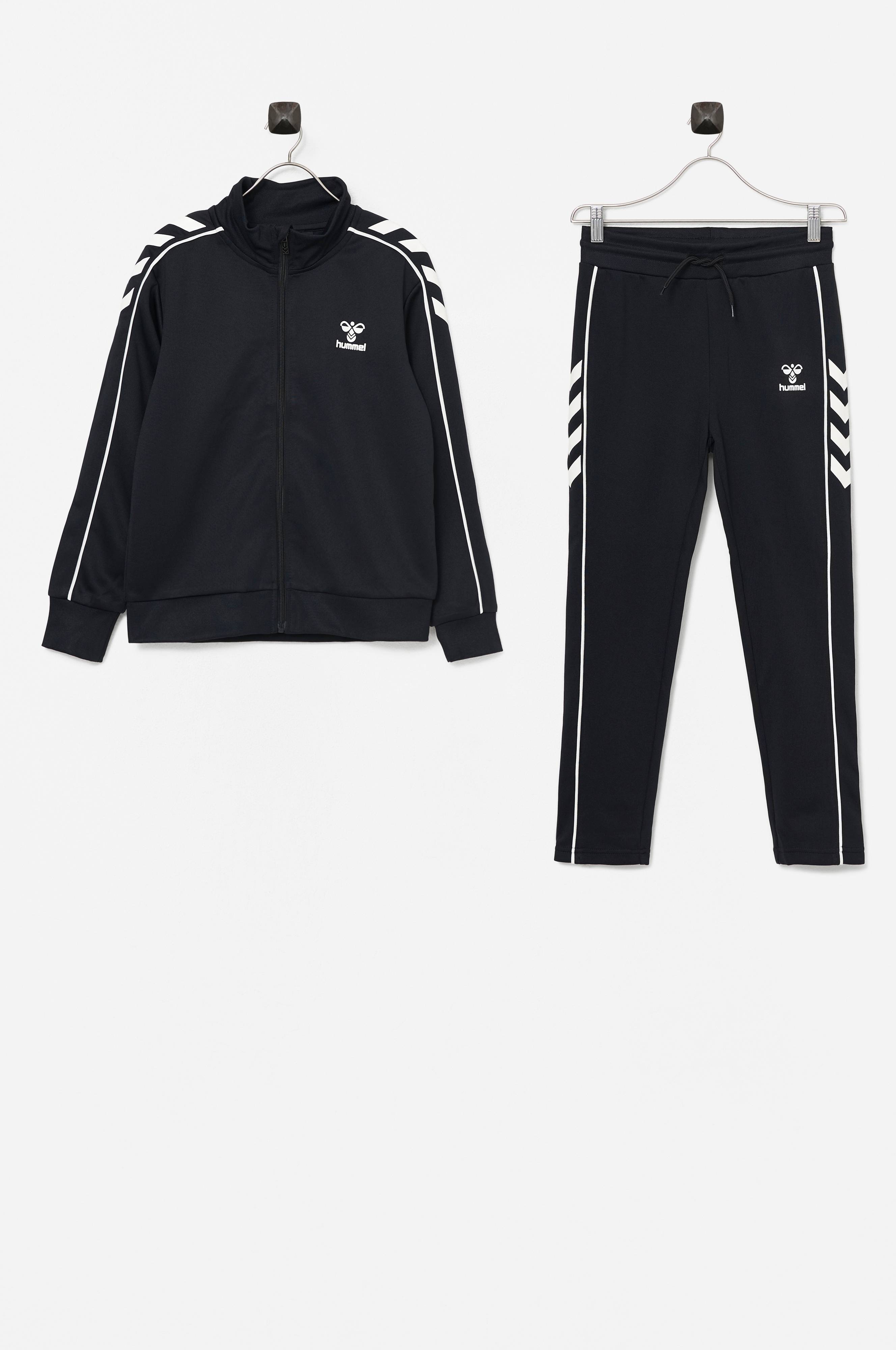 Træningssæt med jakke og bukser i jerseymateriale. Jakke med ribbet standkrave og lynlås. Bukserne har ribbet, elastisk linning. Printede detaljer på siderne og kontrastfarvede paspolerede kanter.