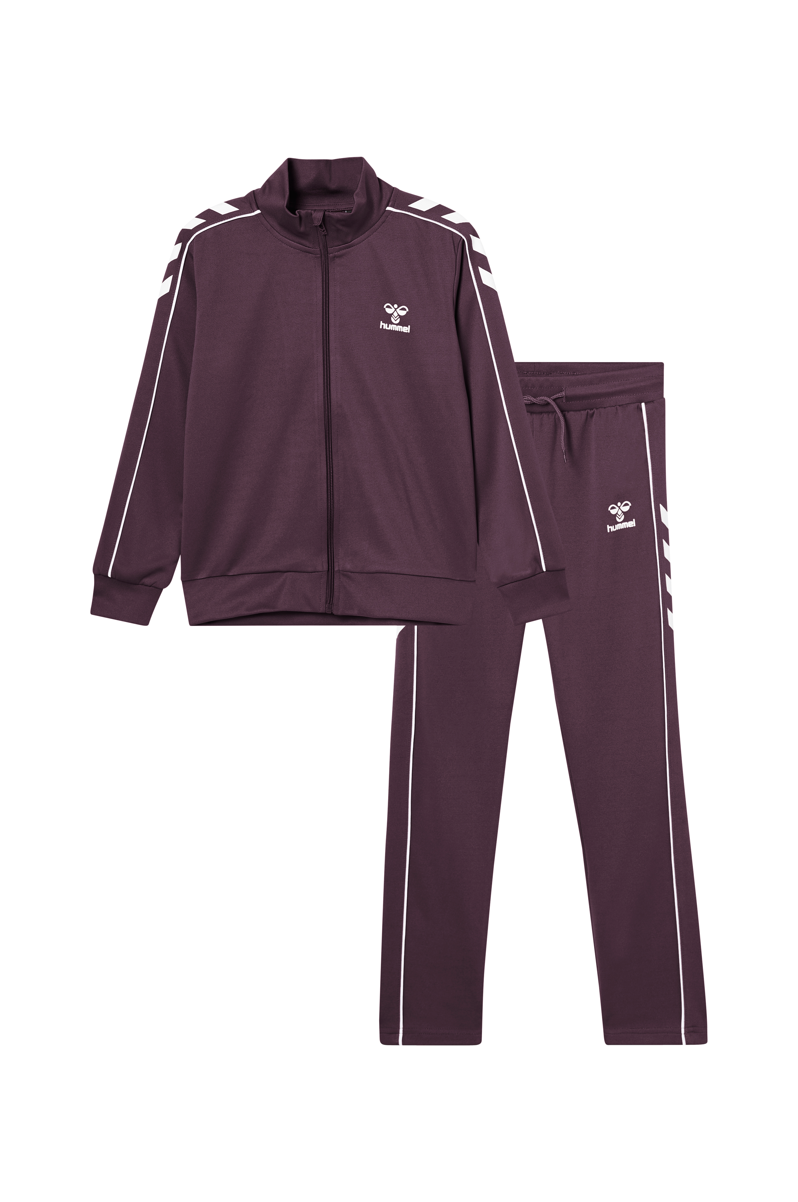 Træningssæt med jakke og bukser i jerseymateriale. Jakke med ribbet standkrave og lynlås. Bukserne har ribbet, elastisk linning. Printede detaljer på siderne og kontrastfarvede paspolerede kanter.