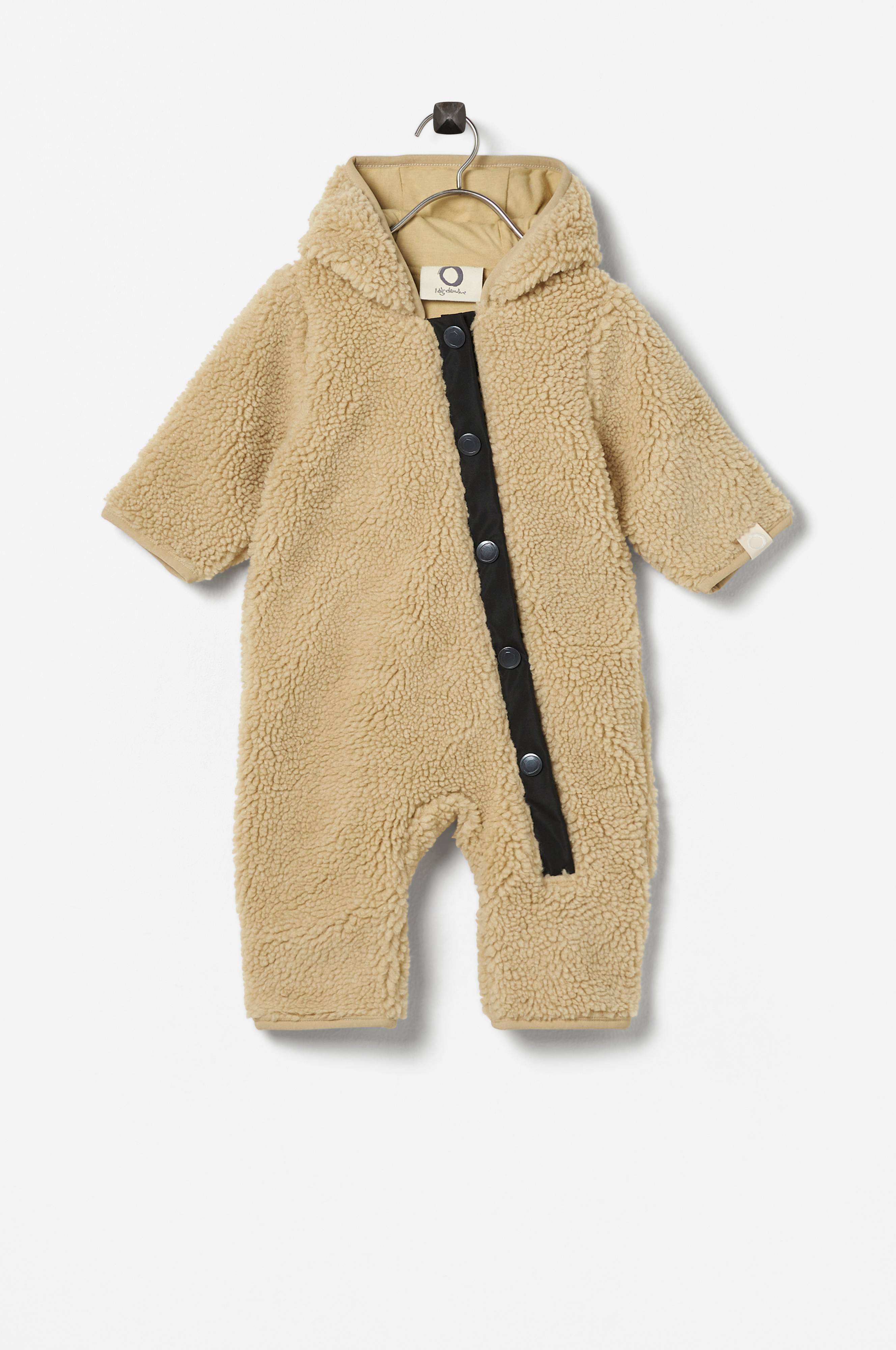 • Bløde overalls i bamsefleece • Lukning med trykknapper • Fast hætte • Overfold ved manchetterne og ved enden af benene • Produktet indeholder genindvundet materiale, som genbruges for at reducere mængden af affald samtidigt med at der ikke anvendes nye ressourcer.