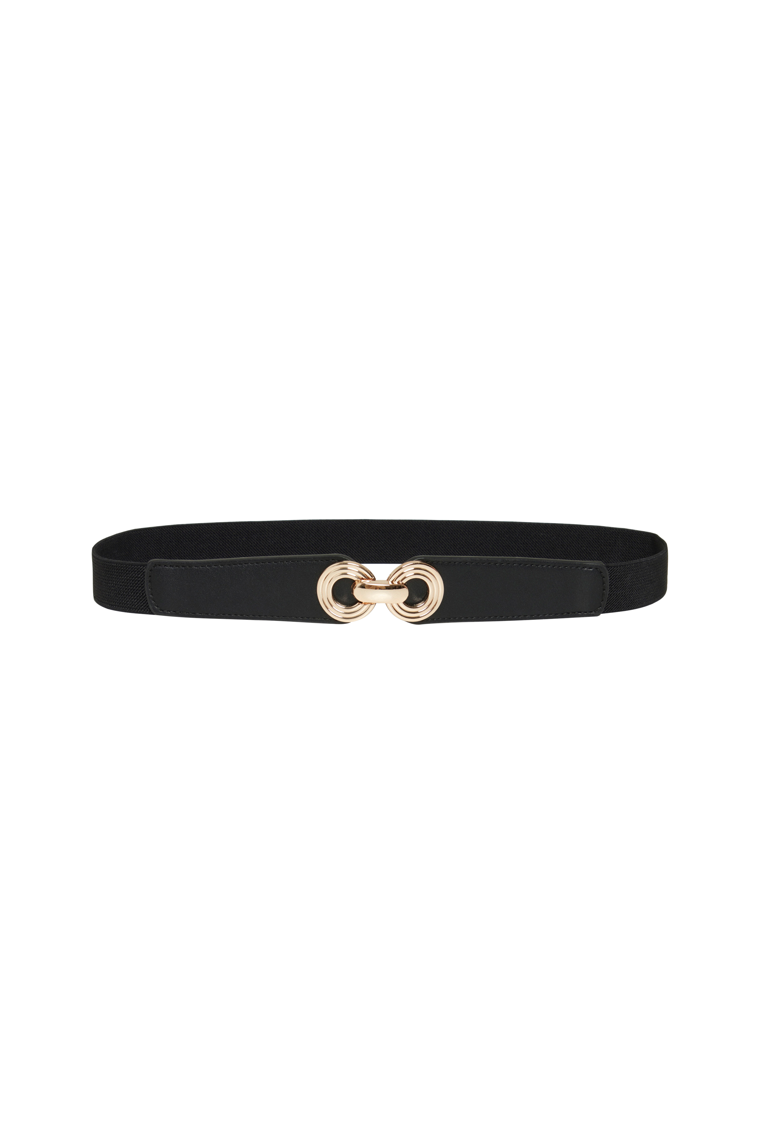 • Tyndt bælte med rundt, guldfarvet spænde•