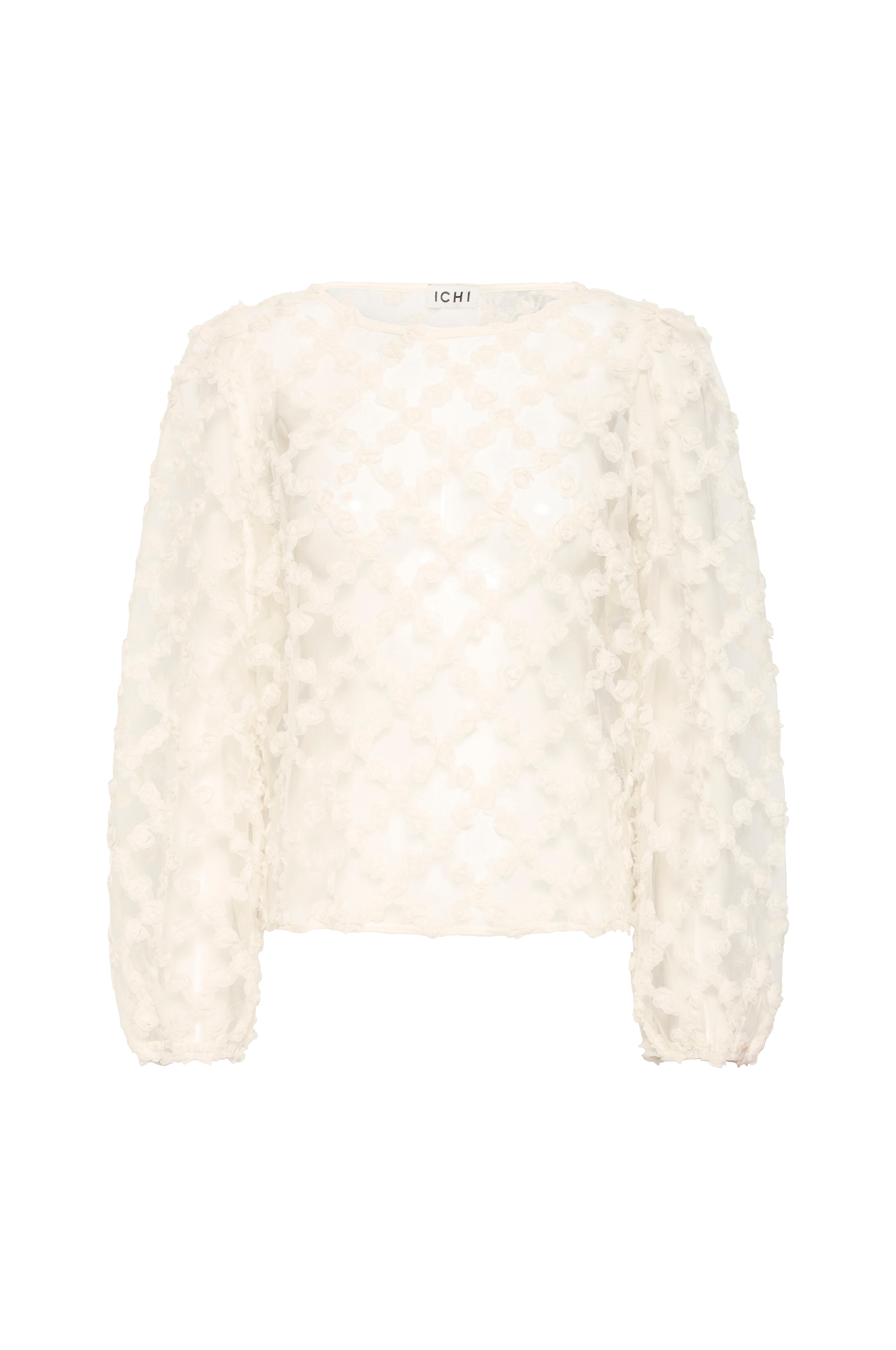 • Transparent bluse med blomstrede applikationer• Rund halsudskæring• Lange ballonærmer• Elastik ved manchetterne