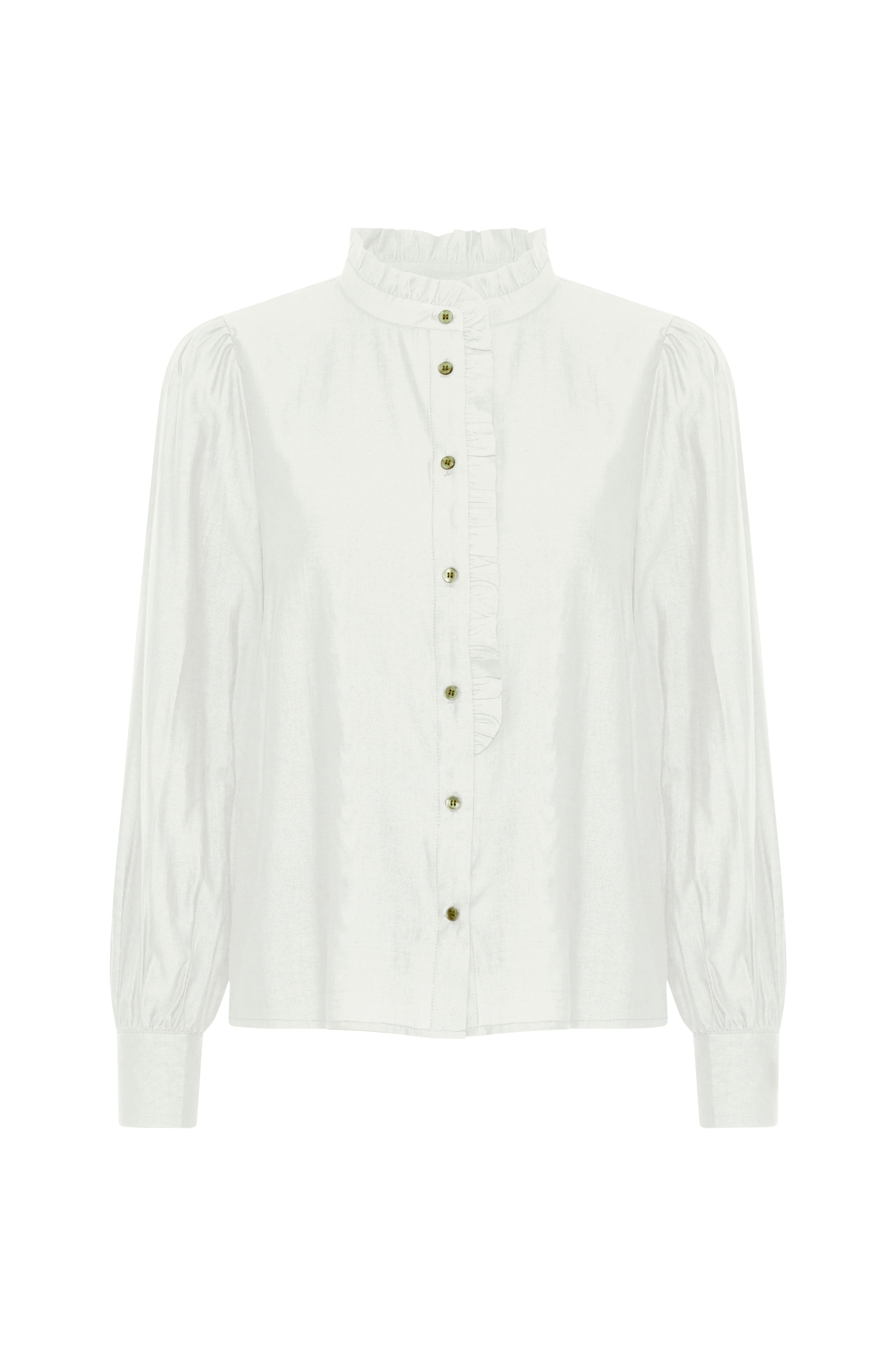 • Lige model i satin• Rund hals med flæsekant og volant på knaplukningen• Langt ballonærme med manchet