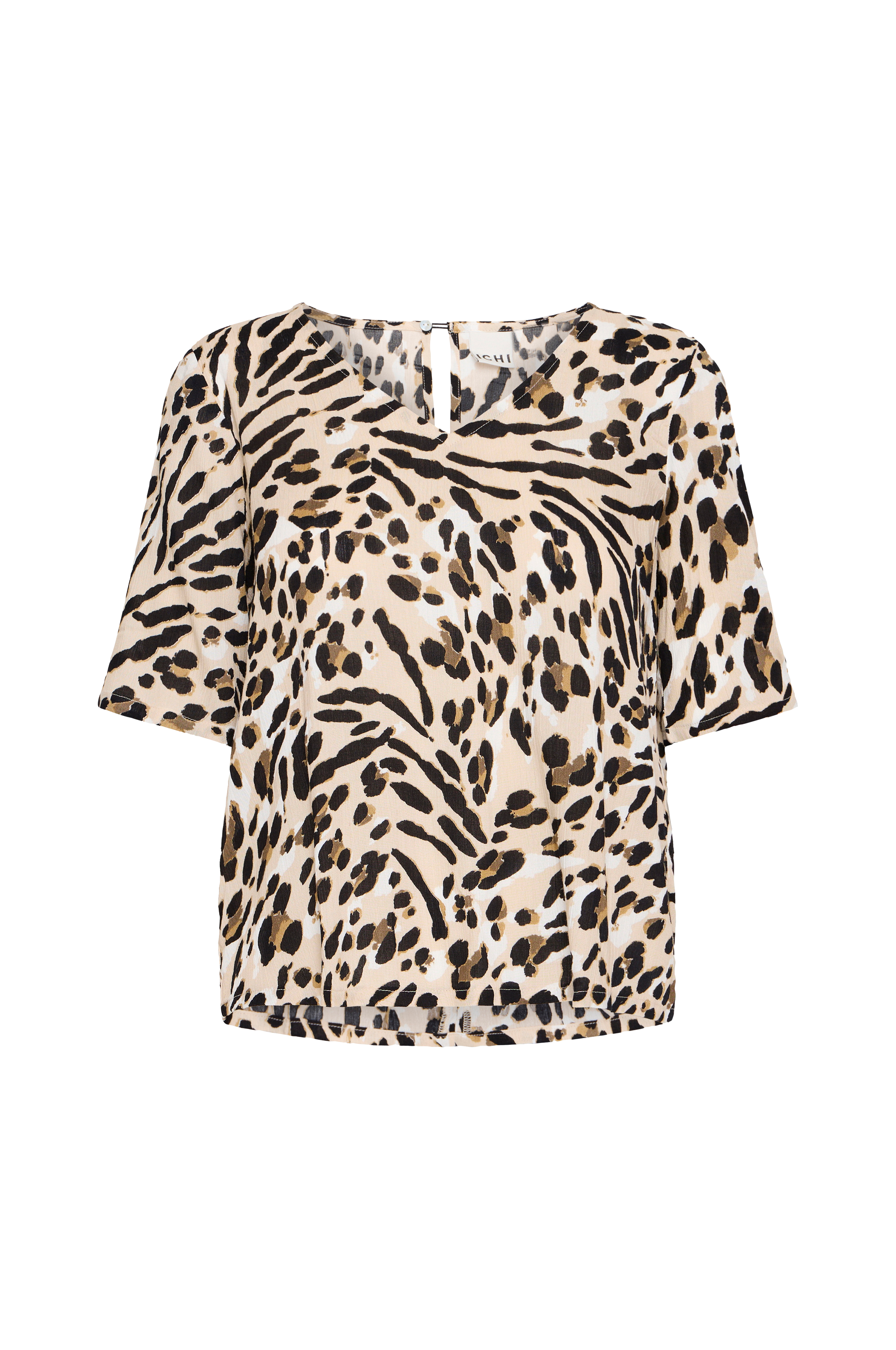 • Leopardmønstret bluse i viskose• V-formet halsudskæring• Åbning oppe bagved med knap i nakken• Korte ærmer