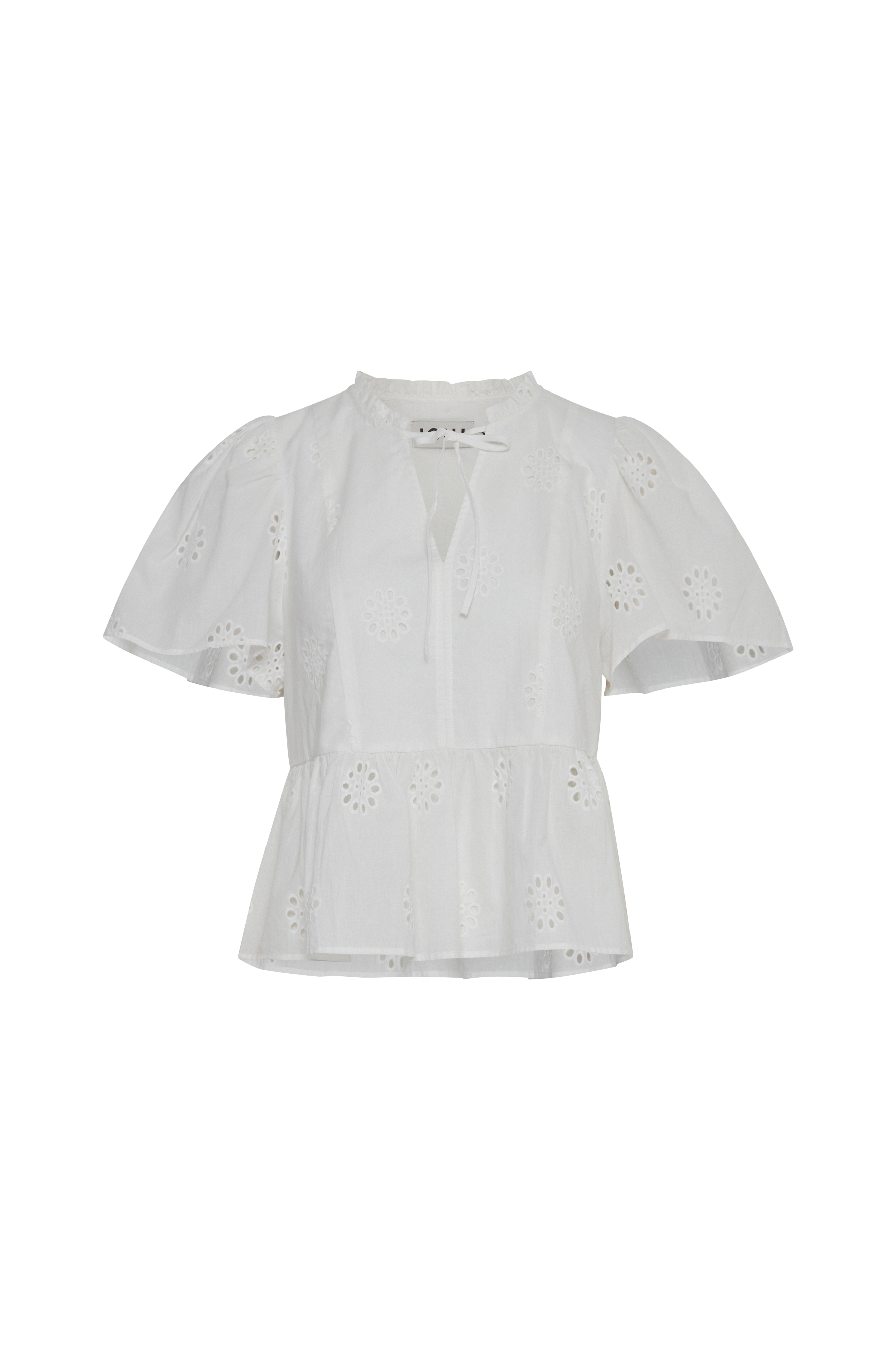 • Peplumdesign med hulbroderier overalt• Halsudskæring med lille volant og tynde bindebånd foran• Korte ballonærmer• Defineret talje med samling• Foret