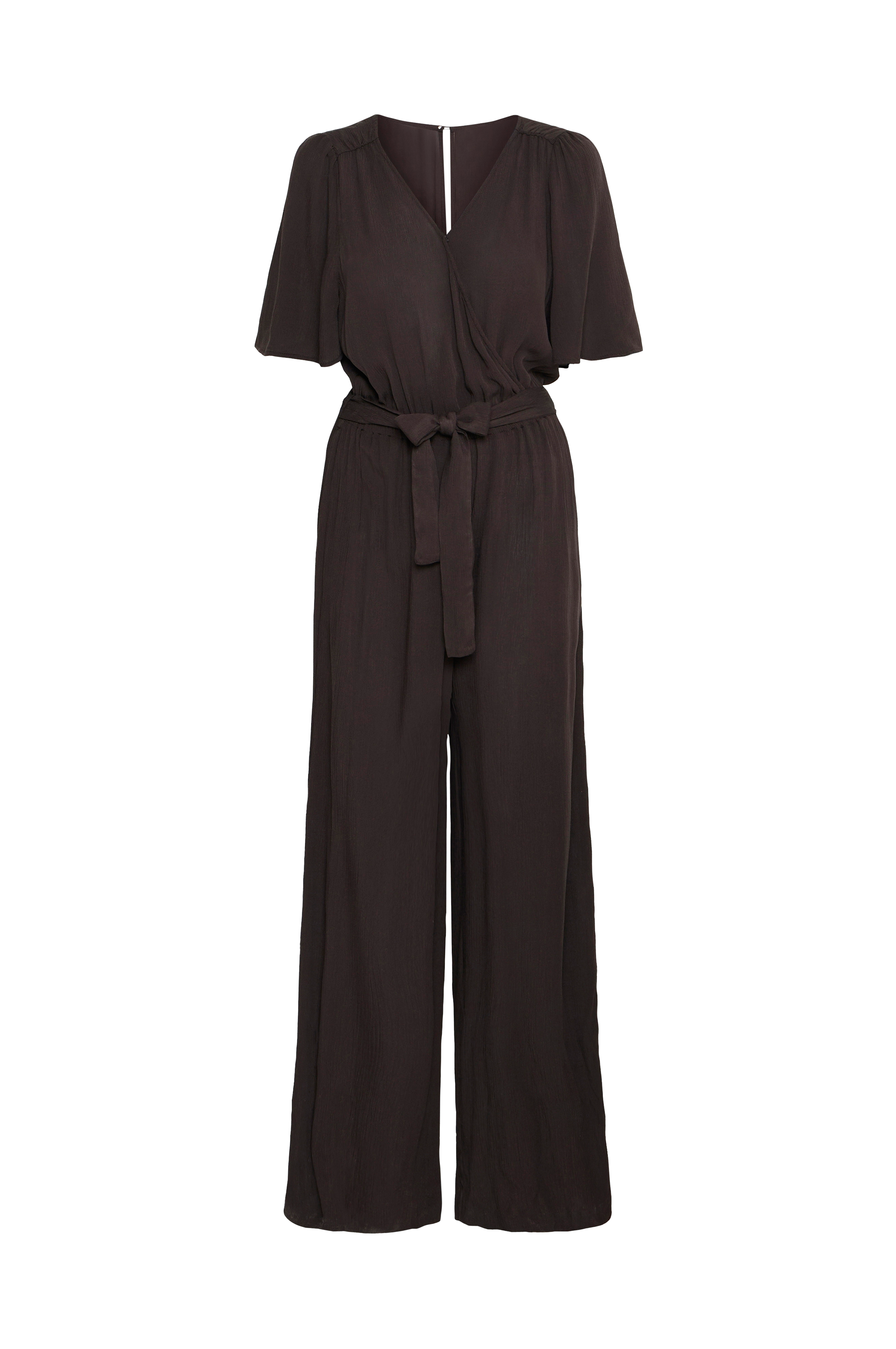 • Model i crepe• Slå-om design på toppen med trykknap på brystet• Samling på skuldrene• Kort, bredt ærme• Elastisk talje med bindebælte• Brede, lige ben