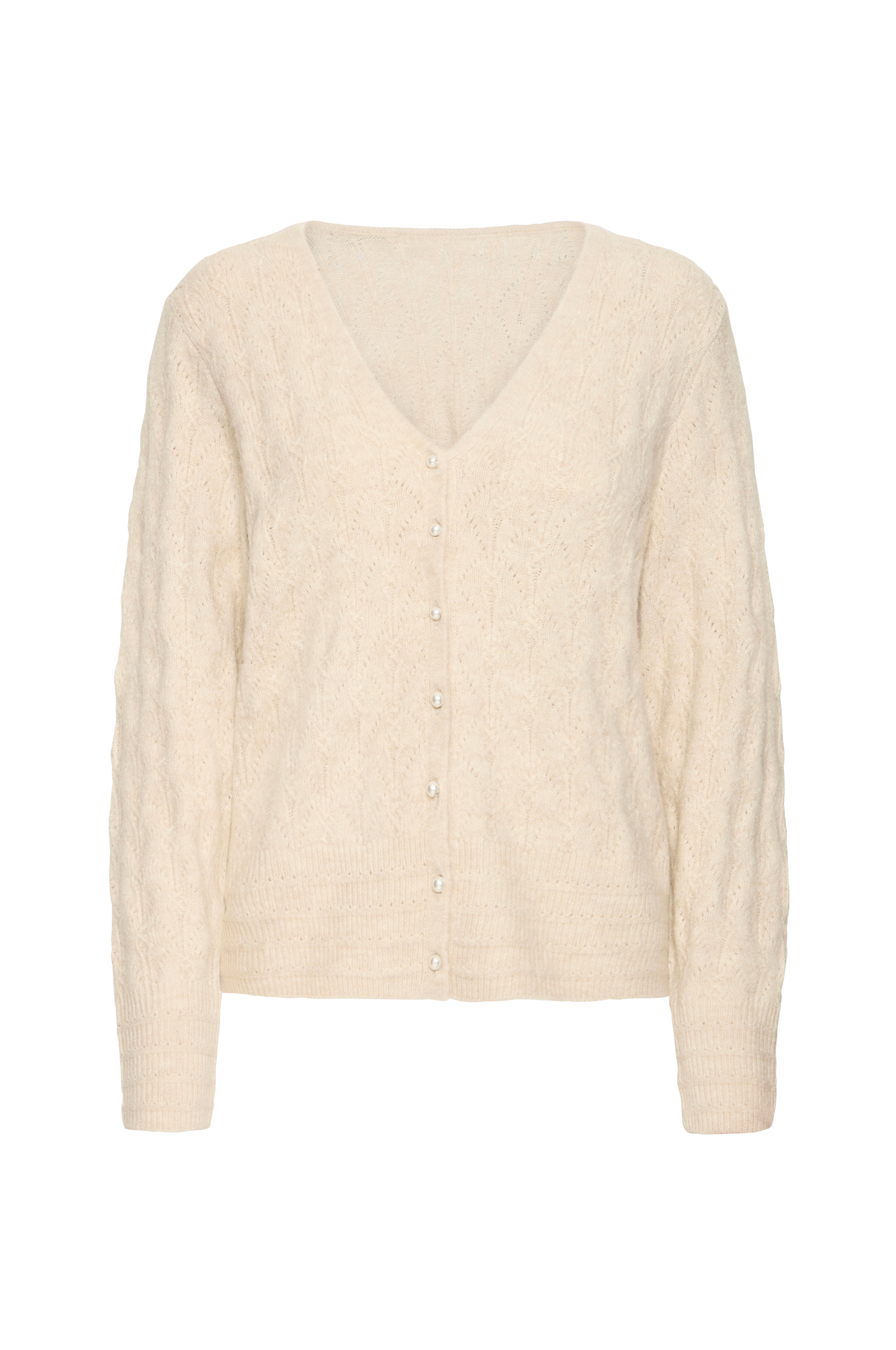 • Mønsterstrikket model• V-formet halsudskæring• Dekorative perleknaper foran• Lange, indsnævrende ærmer• Ribstrik ved nederste kant og ved manchetterne