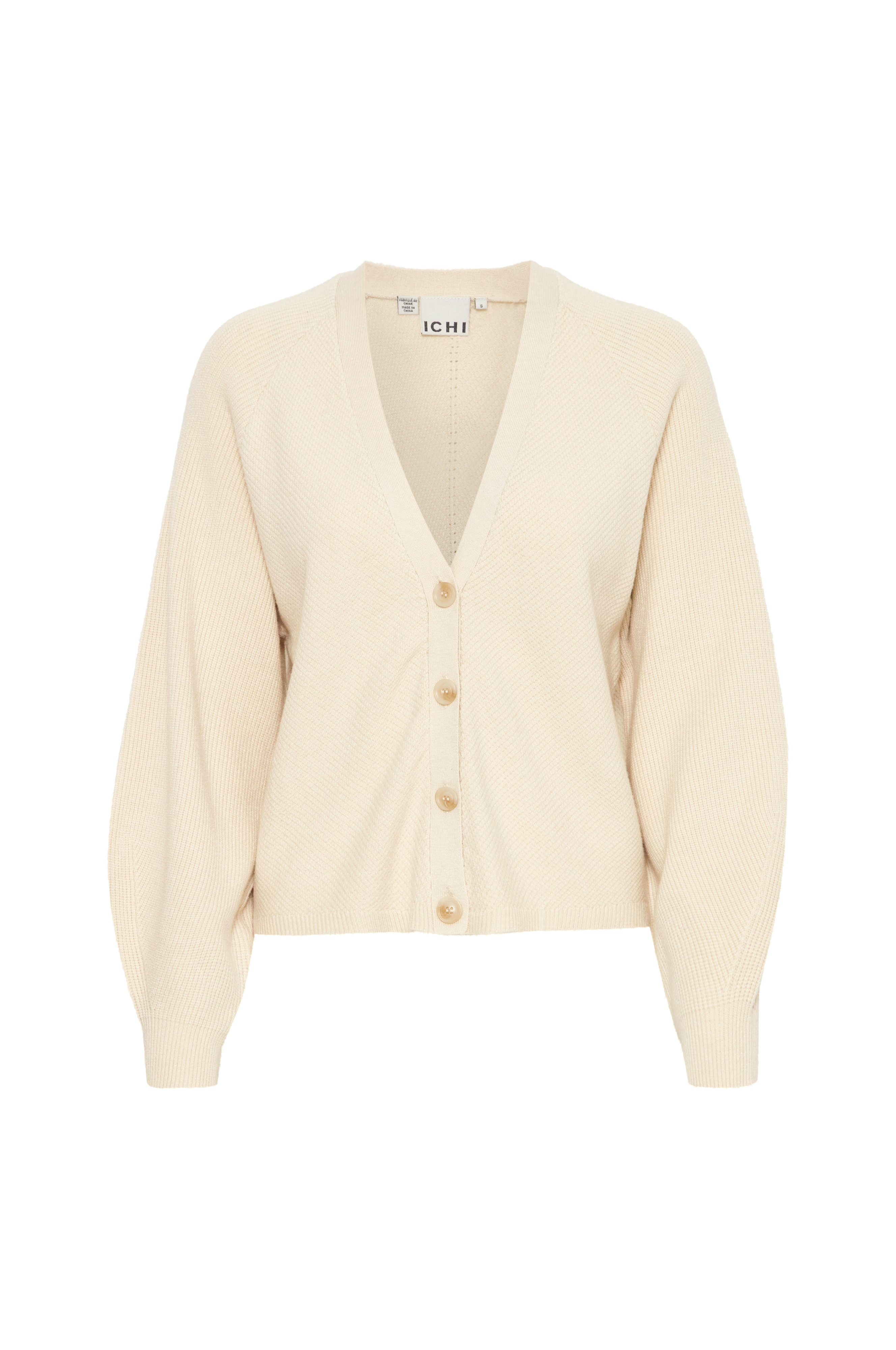 • Blød, strukturstrikket model• V-formet halsudskæring• Knapper foran• Ribstrikket raglanærme• Tynd ribstrik ved nederste kant