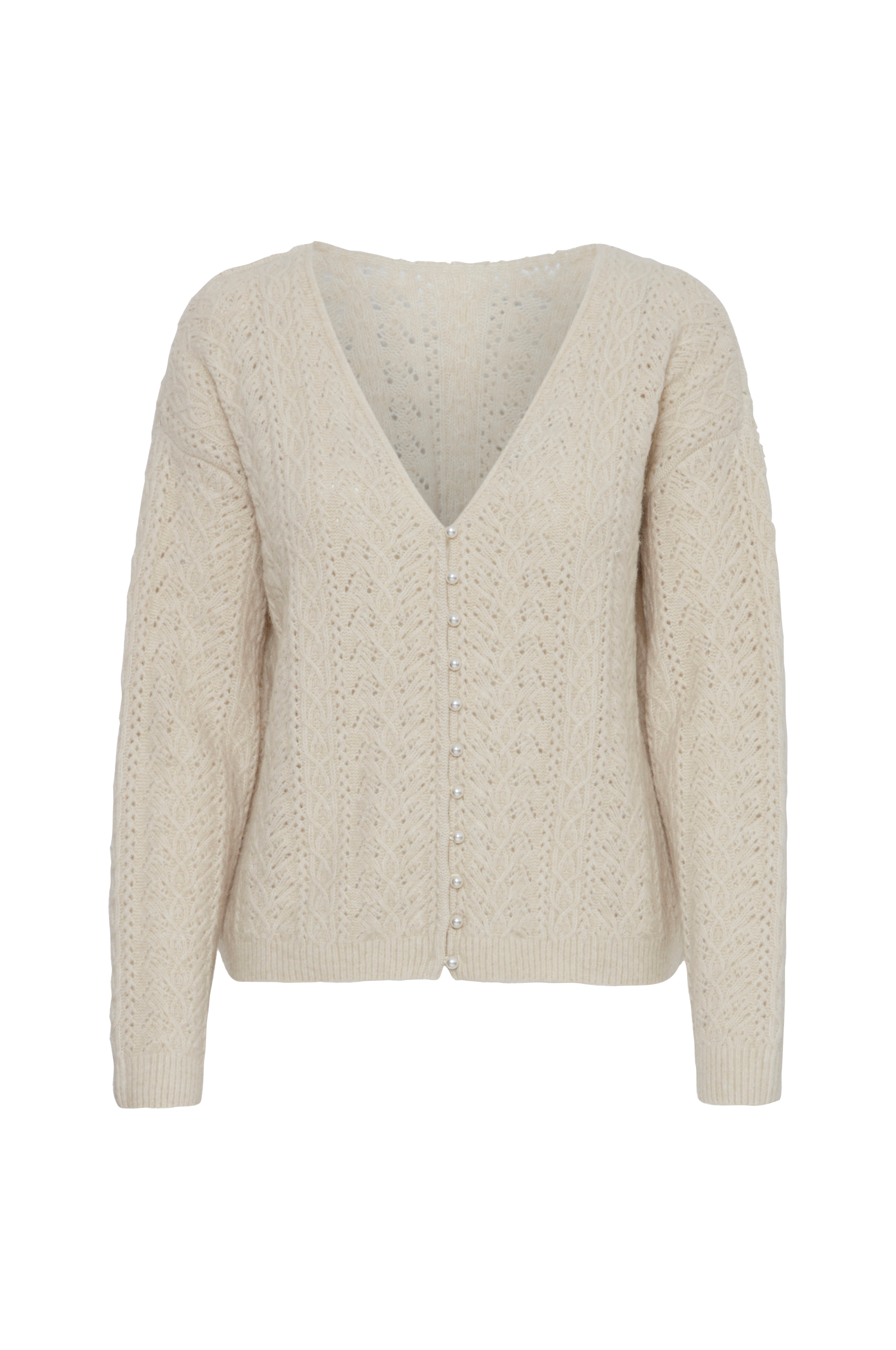 • Mønsterstrikket model• V-formet halsudskæring• Løkkelukning med perleknaper• Langt ærme• Ribstrik ved nederste kant og ved manchetterne