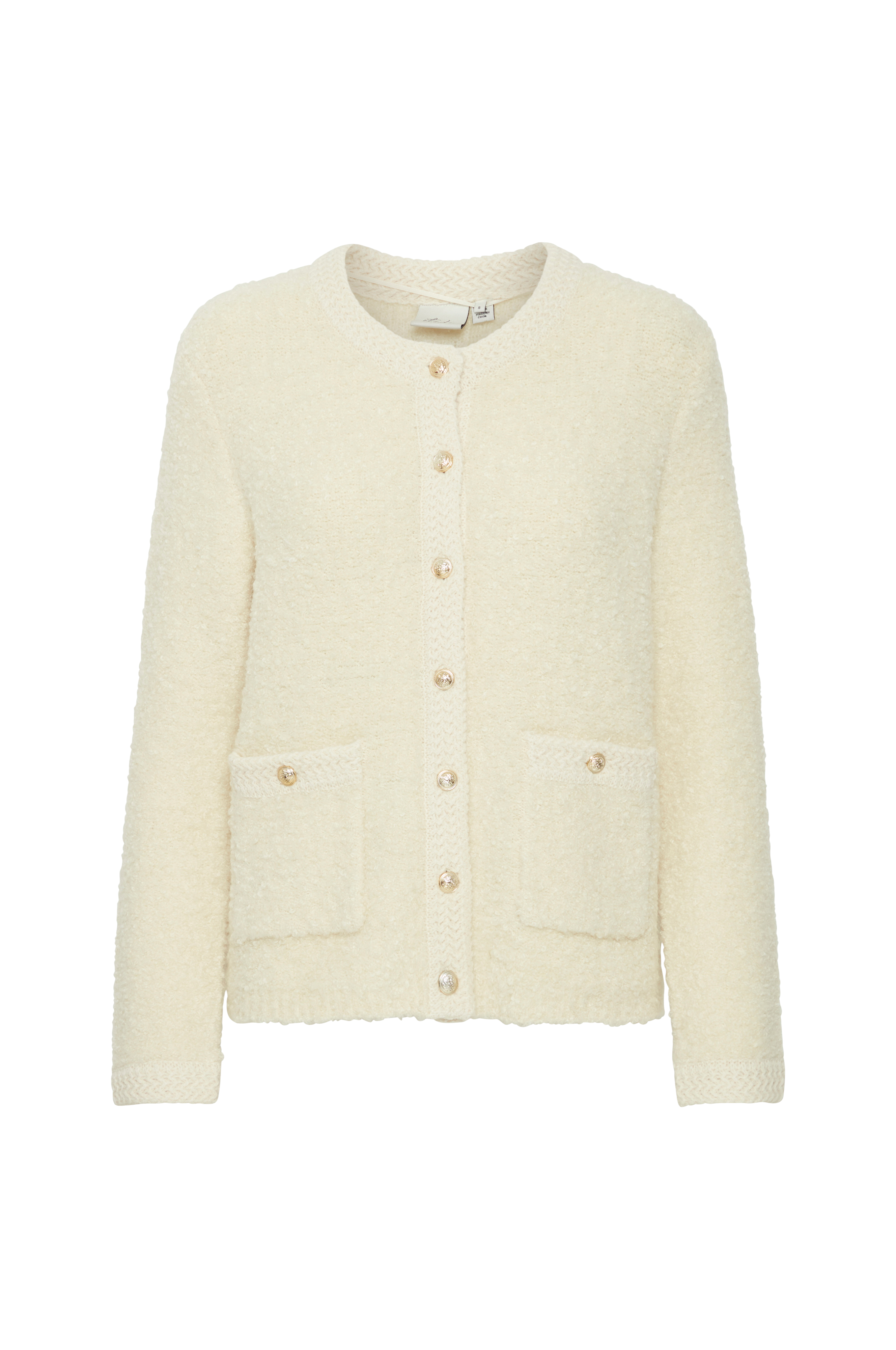 • Lige model i bouclégarn med dekorativt strikkede kanter• Dekorative knapper• To lommer• Langt ærme