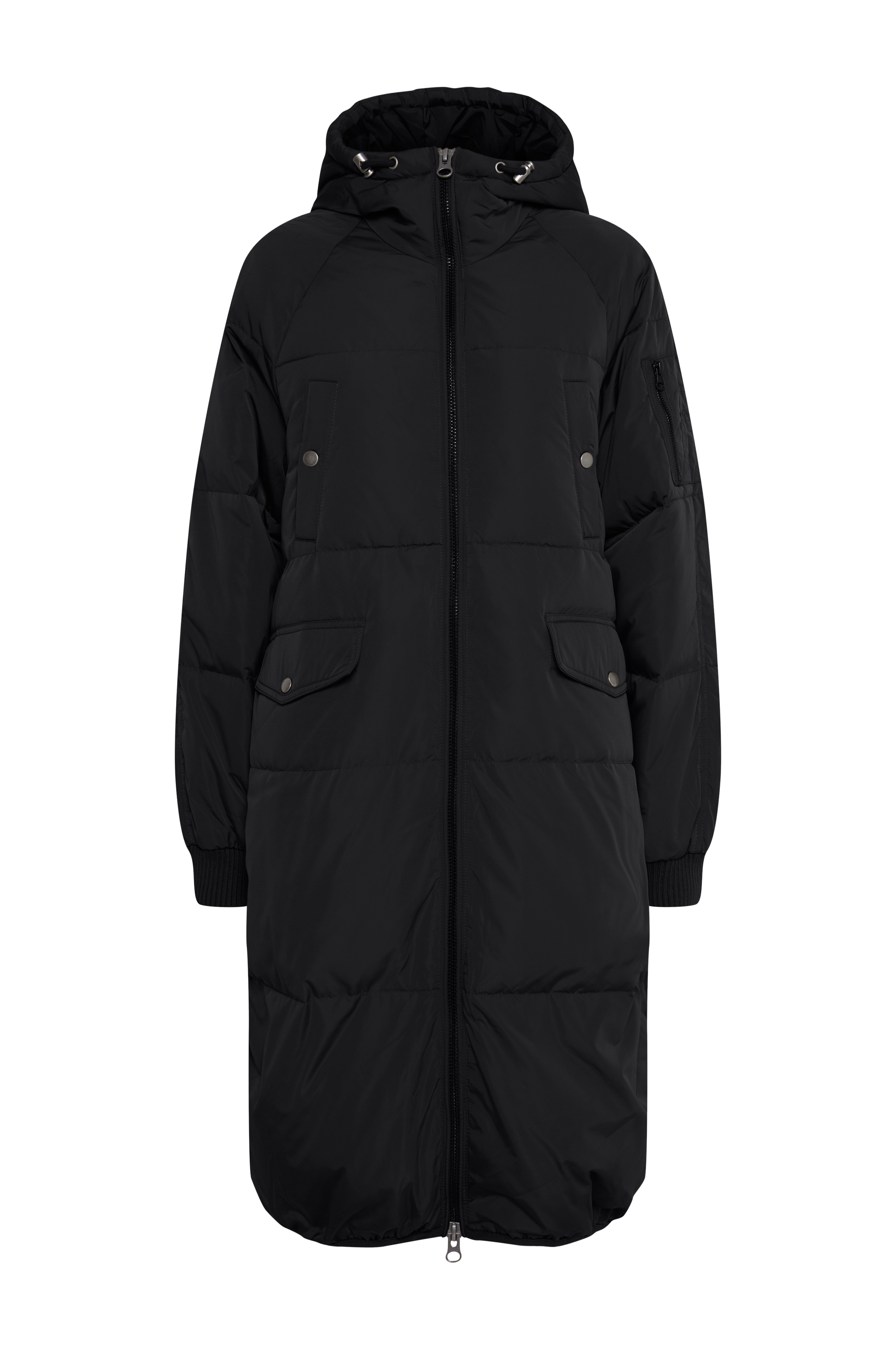 Dunfrakke ihBunala Down Jacket fra ICHI med varmt, let fyld af dun og fjer. Fast hætte som har løbegang med stop. Høj krave og lukning med 2-vejslynlås. Ribstrikkede kanter i ærmet. og løbegang med stop i kanten forneden. Fire lommer foran som kan lukkes med trykknap og lomme på venstre ærme med lynlås. En inderlomme. Elastisk kantbånd forneden. Længde ca. 103 cm i str. S.
