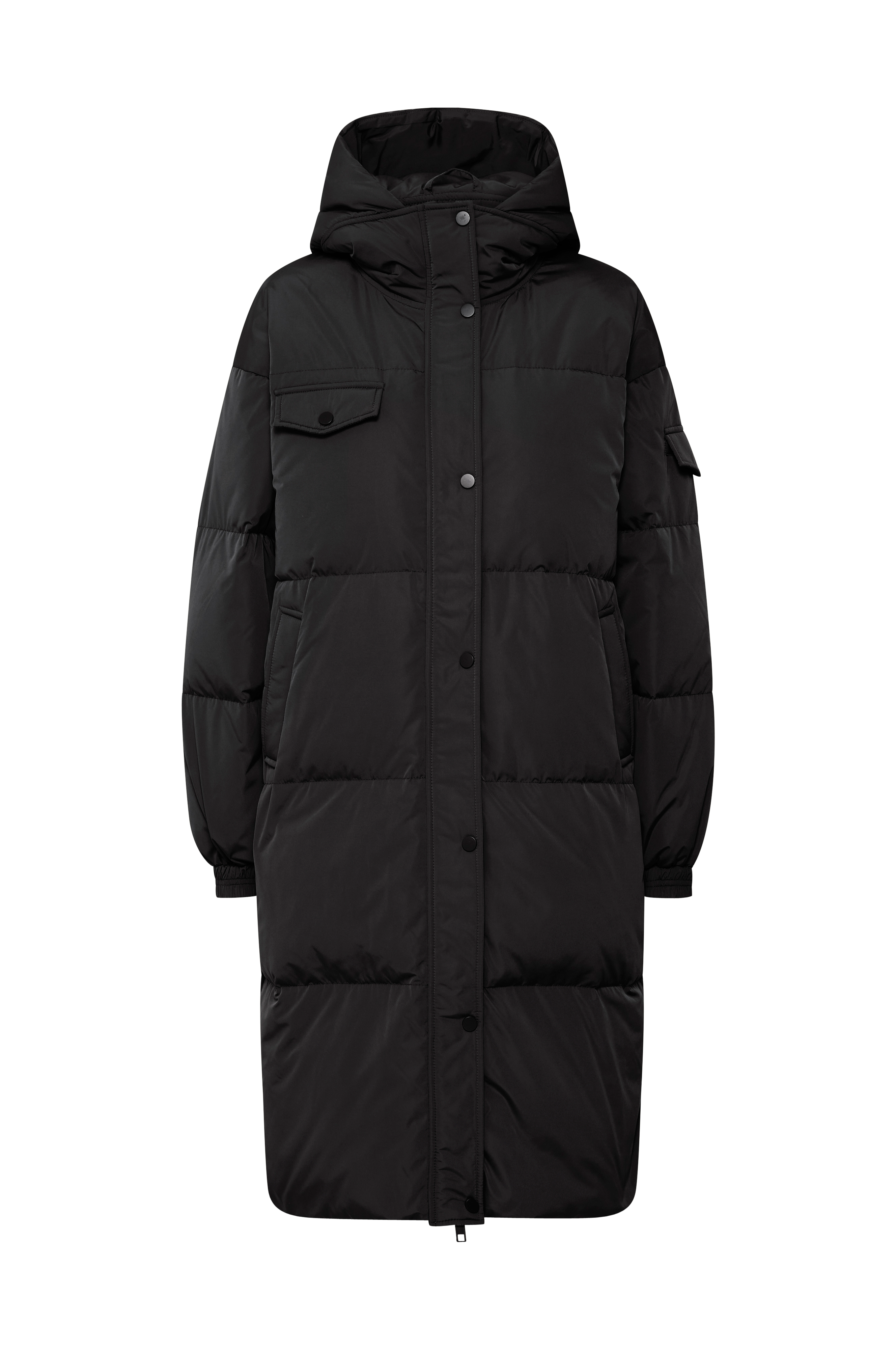 • Dunfrakke med hætte og høj krave• To-vejs lynlås med vindflap og trykknapper• Lomme med låg og trykknap på brystet og på det ene ærme• Sidelommer med trykknap• Elastik ved manchetterne• Slids nede i siderne• Længde: 100 cm i størrelse S