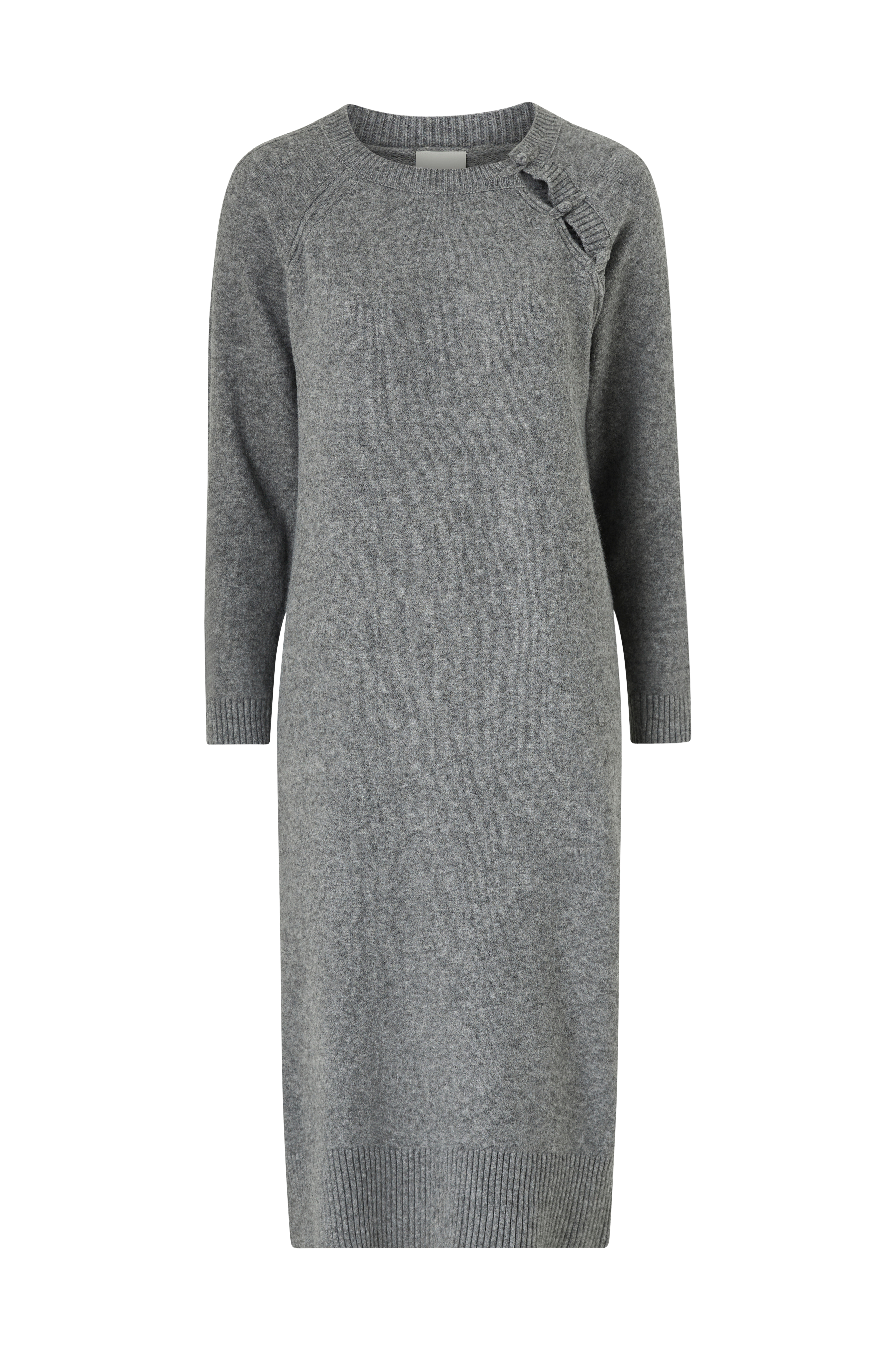 • Blød, fintstrikket kjole• Rund, ribbet halsudskæring• Lange ærmer• Ribbede ærmeafslutninger• Knapdetaljer på toppen• Ribdesign langs siderne• Slids nederst i den ene side• Ribbet søm• Længde: 117 cm i størrelse S