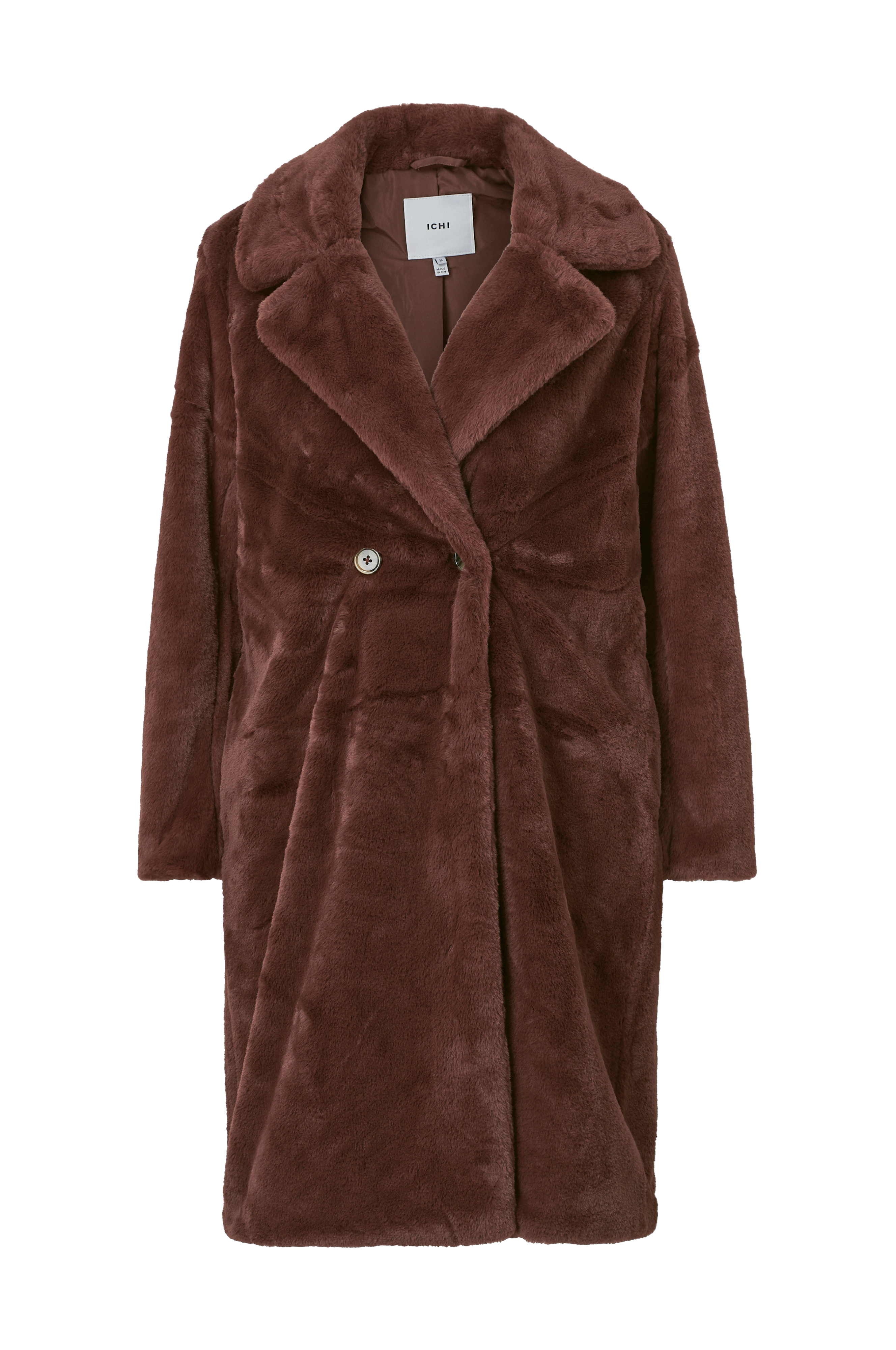 Kunstpels ihHaya Jacket fra ICHI. Oversizemodel med stor krave og stort revers samt to knapper foran - kan knappes både til venstre og højre. Indsatte lommer i sidesømmene. Længde ca. 97 cm i str. 36.