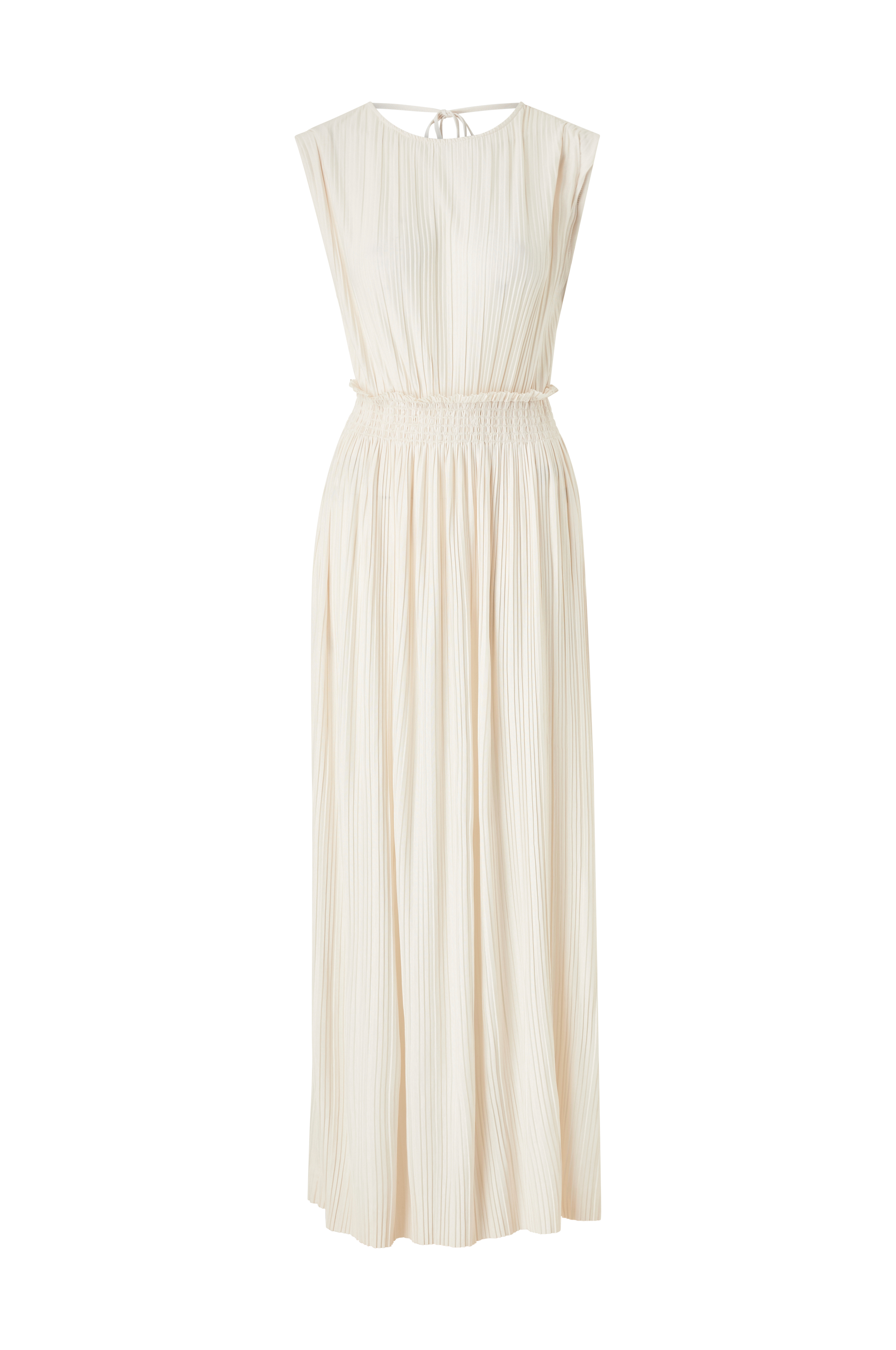 • Ærmeløs, plisseret model• Rund hals med bindebånd i nakken og udskæring i ryggen• Elastisk smock ved taljen• Længde: 144 cm i størrelse S