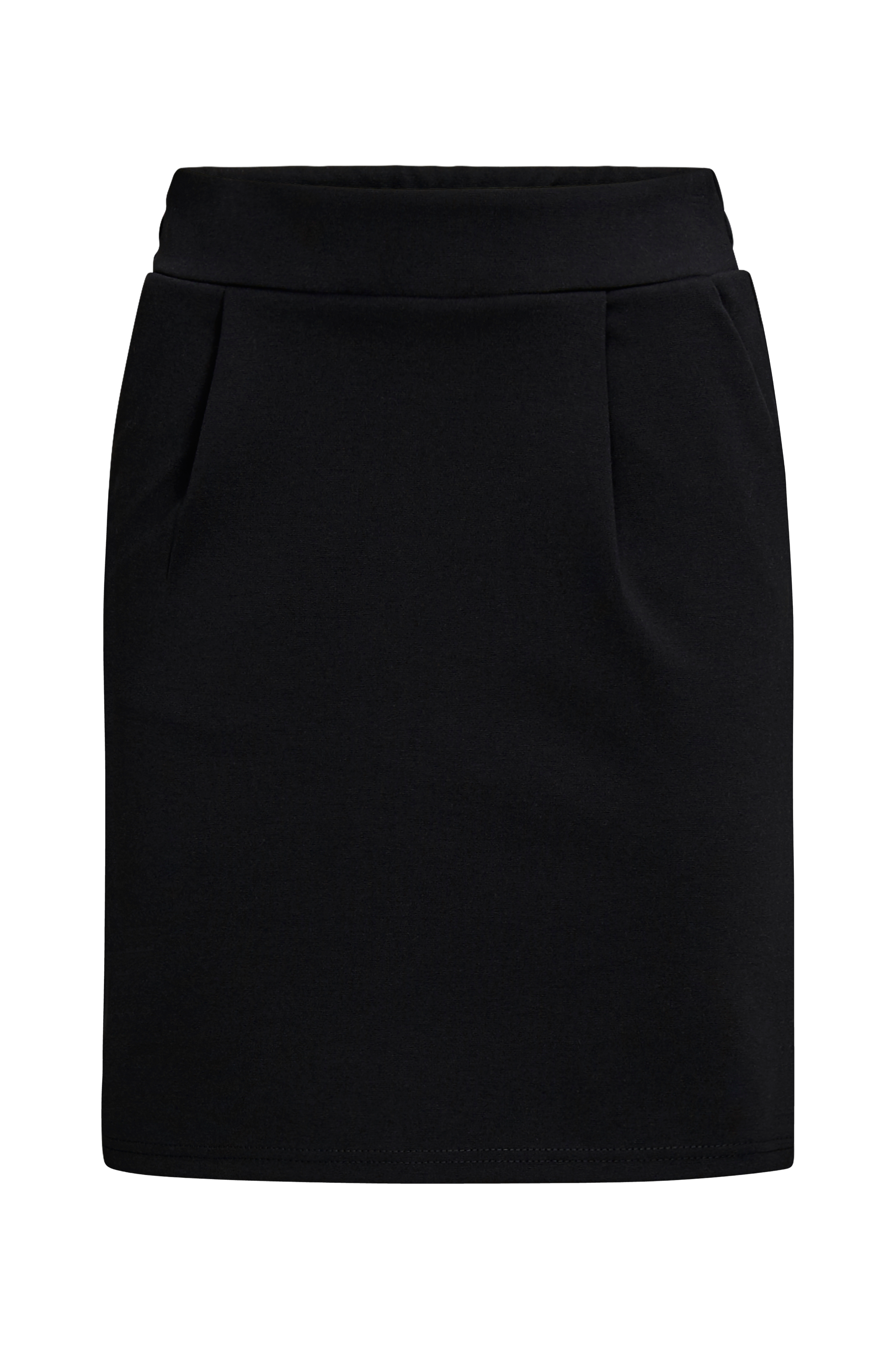 Nederdel Kate Skirt fra ICHI. Lige model med lagte læg og to skråtskårne lommer foran. Påsyet linning med indsat elastik bagpå og to indsatte snydelommer. Af blød stretchjersey. Længde ca. 49 cm i str. S.