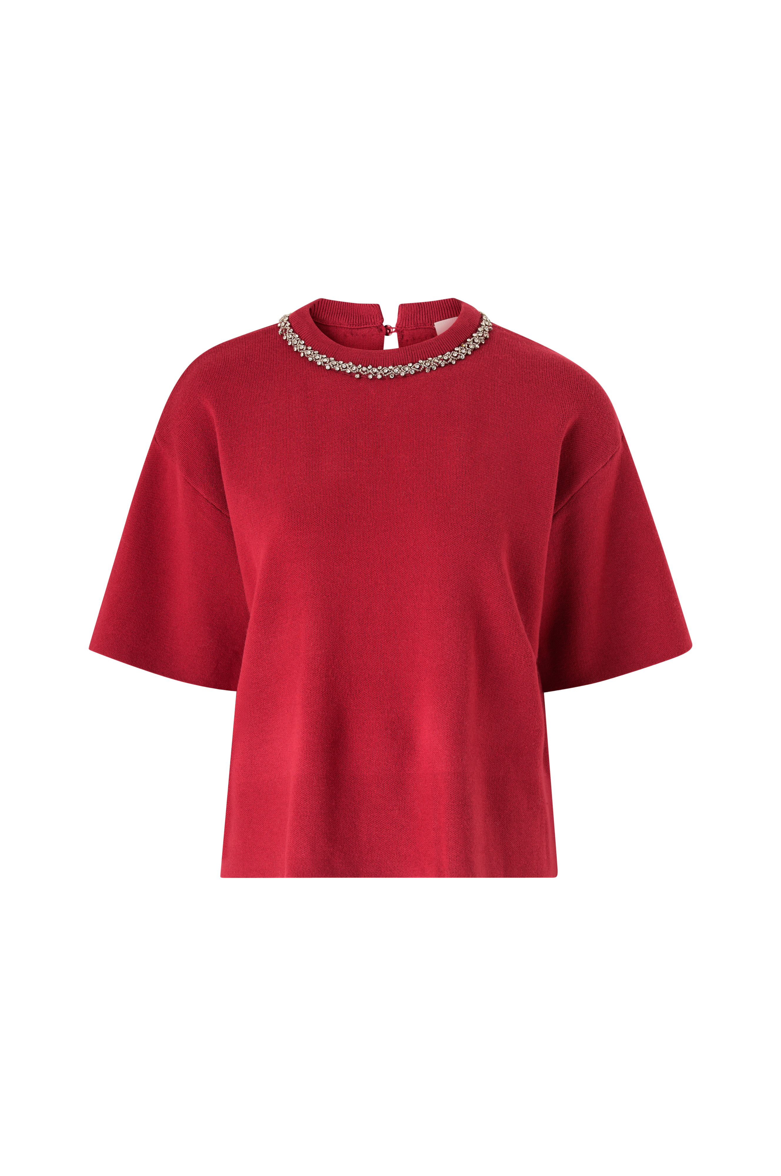 • Blød, fintstrikket Pullover med korte ærmer• Rund, ribstrikket halsudskæring med rhinstene• Nøglehulsåbning med knap i nakken