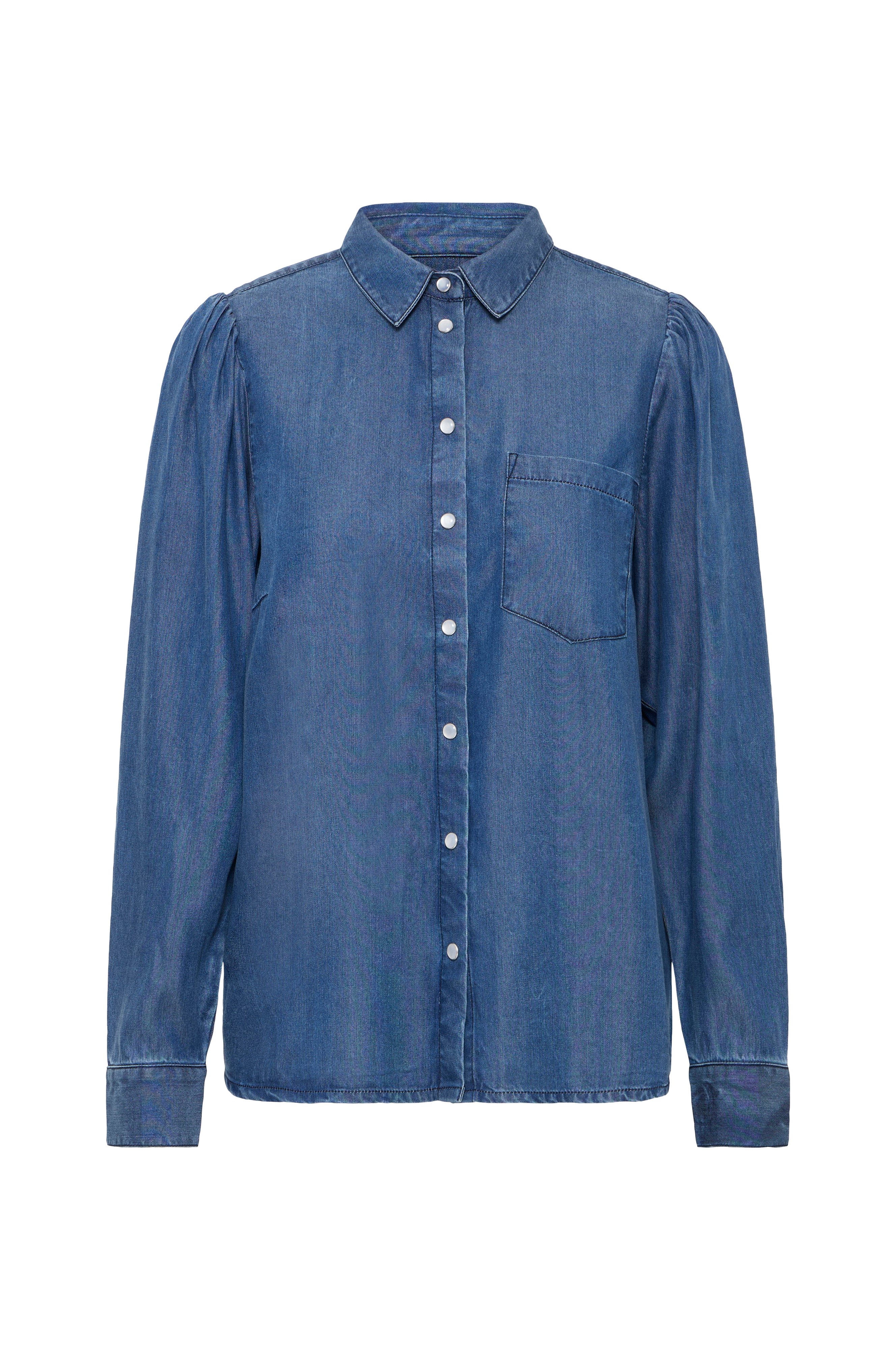 • Skjorte i blød bomuldsdenim• Lille krave• En brystlomme• Ballonærme med manchet ved manchetterne• Dekorative trykknapper hele vejen frem• Afrundet søm