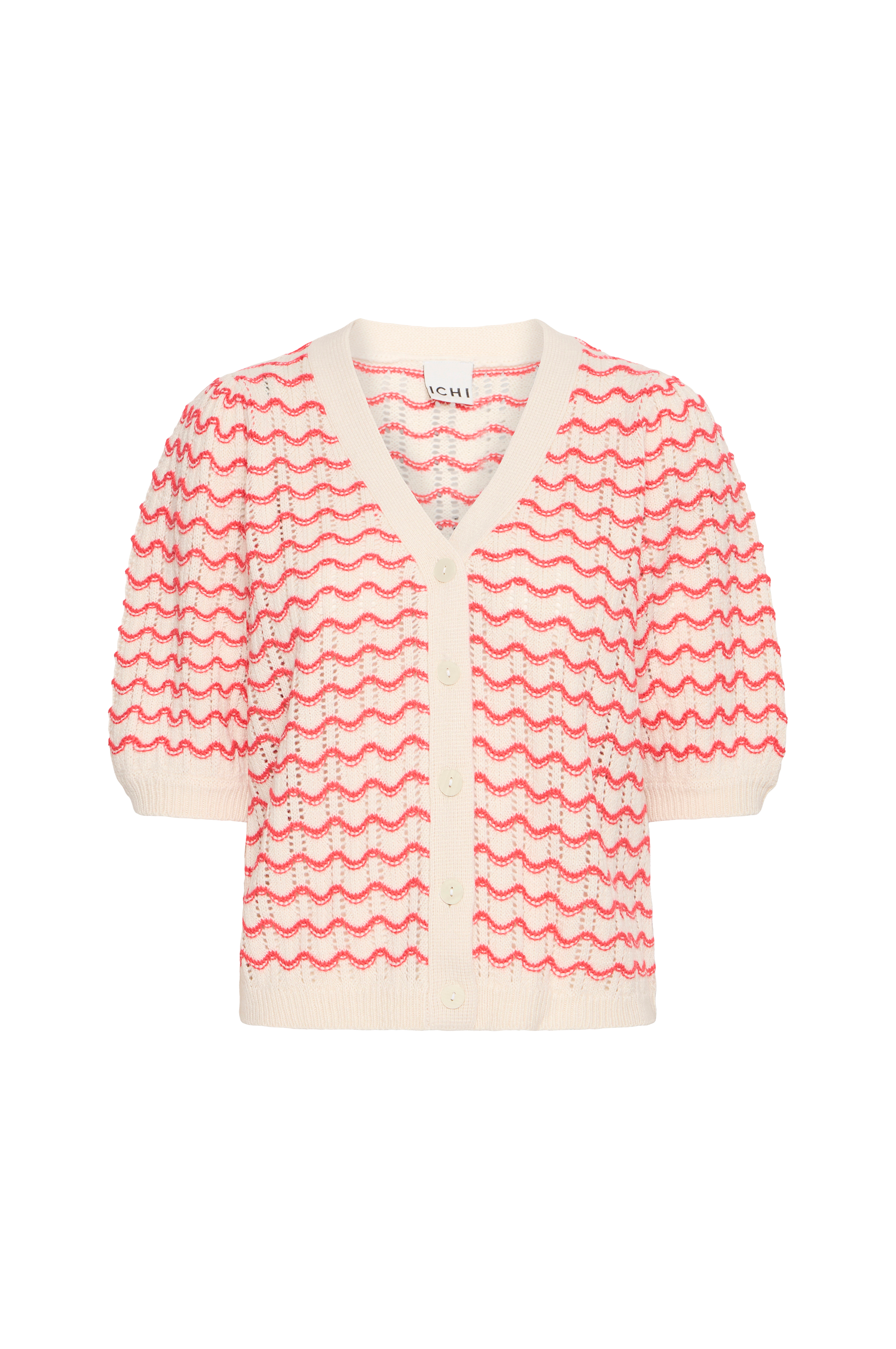 • Bred, mønsterstrikket model• V-formet halsudskæring• Knapper foran• Bredt, halvlangt ballonærme• Ribstrik nederst og ved manchetterne