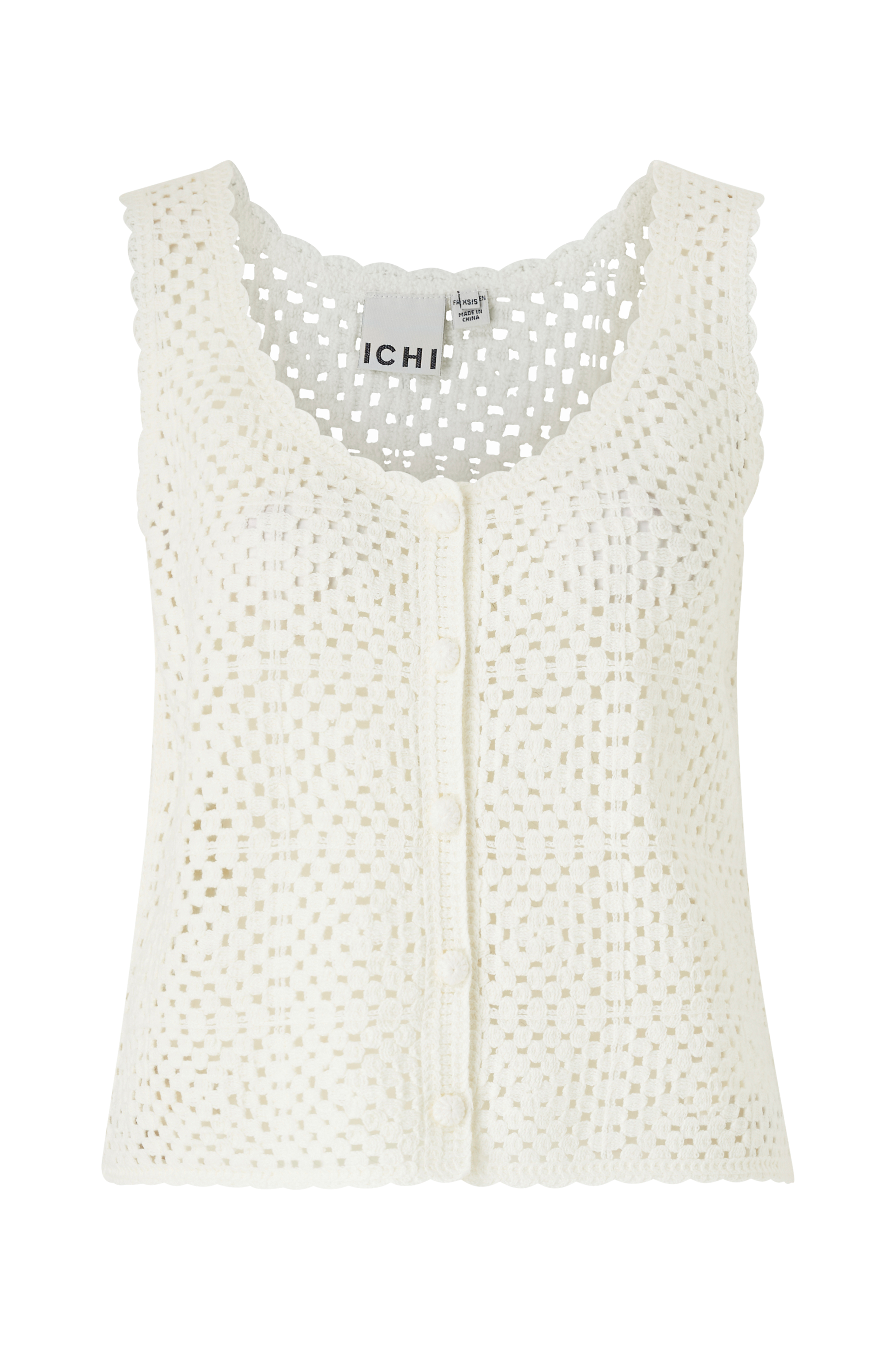• Mønsterstrikket, ærmeløs model• Rund hals• Beklædte knapper foran• Bølgede kanter