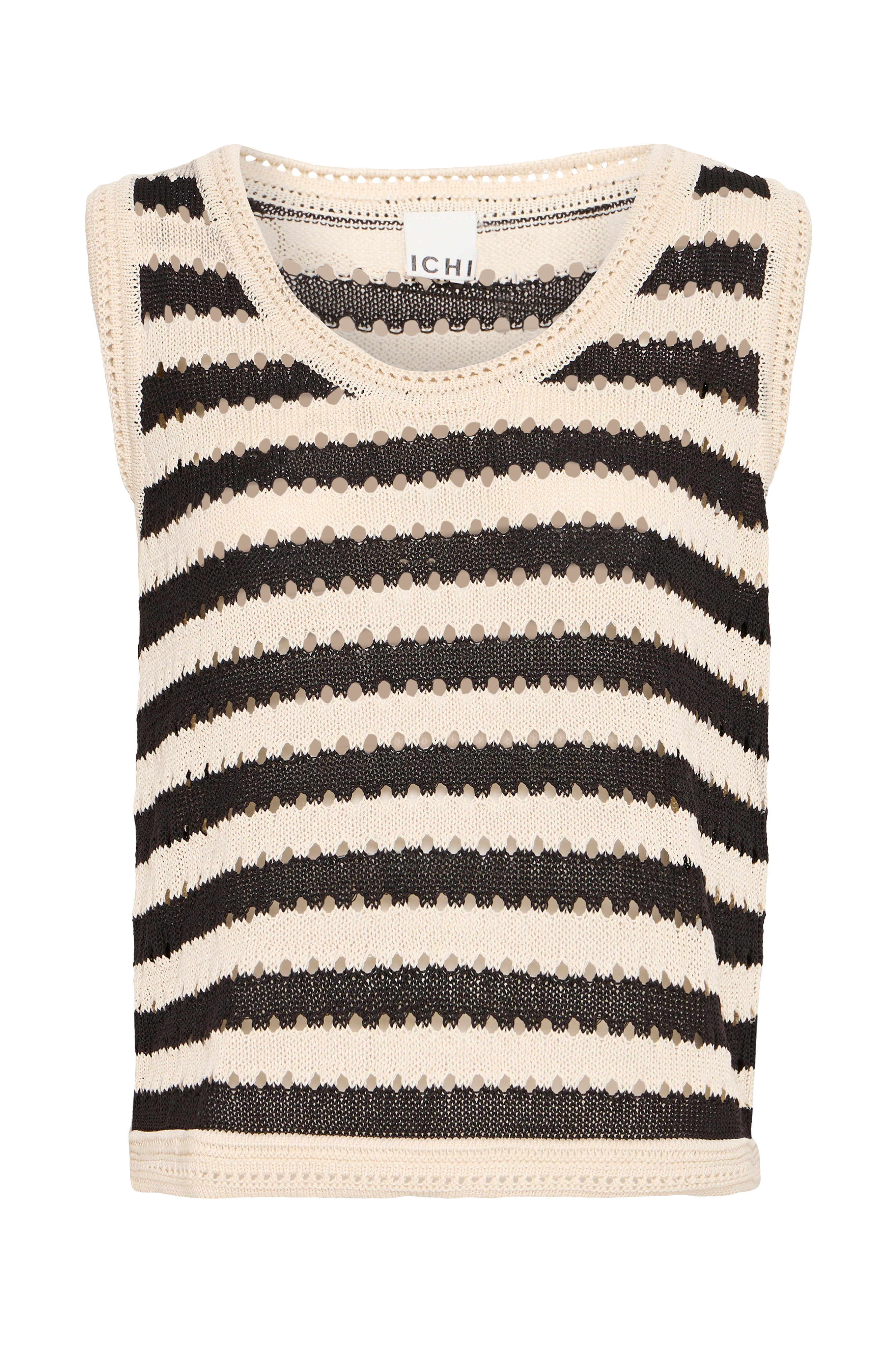 • Ærmeløs, mønsterstrikket model med dekorativt strikkede kanter• Rund hals