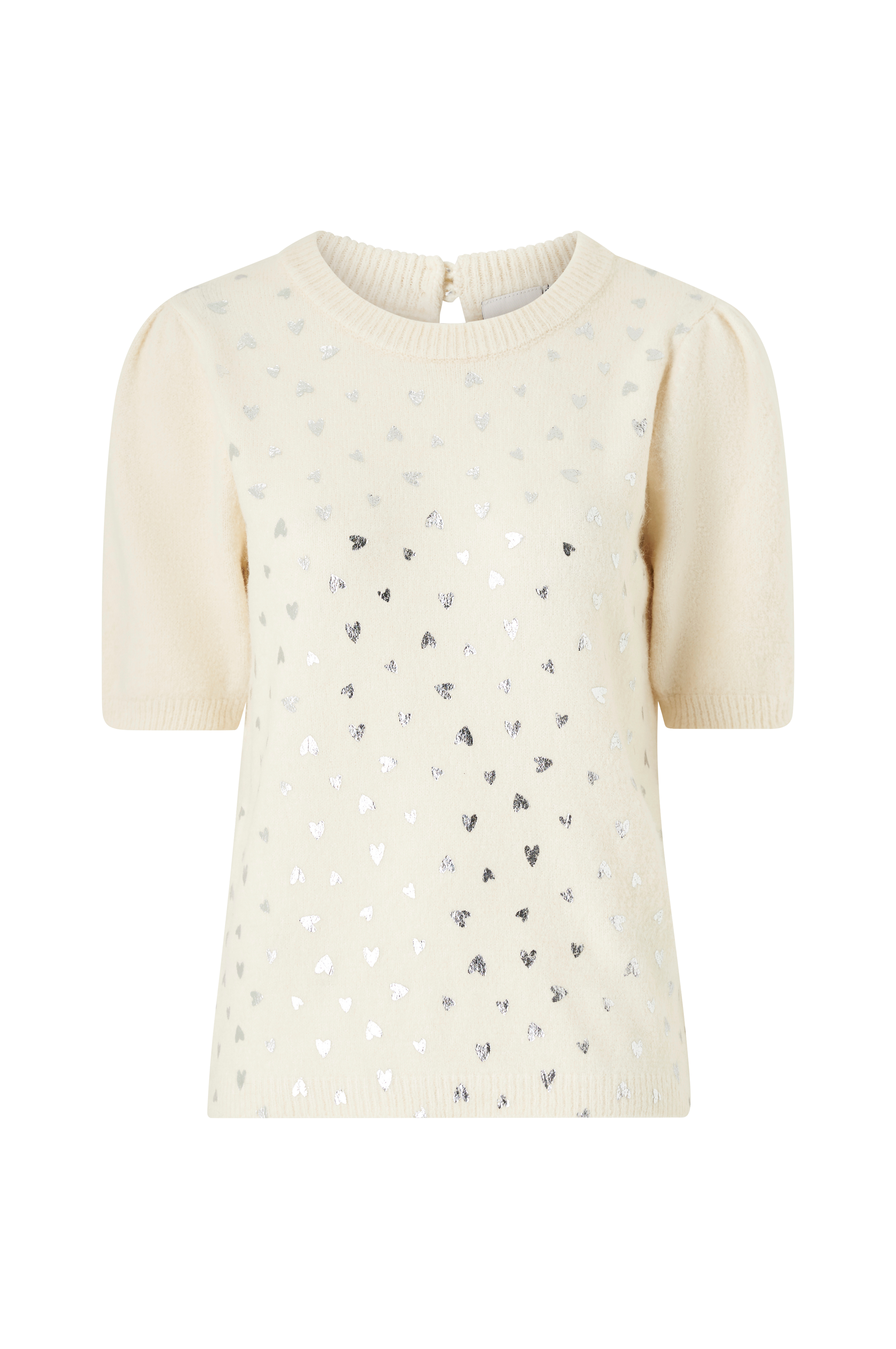 • Glatstrikket model med printede, sølvagtige hjerter foran• Bred halsudskæring med ribkant og knap i nakken• Kort ballonærme• Ribstrik nederst og ved manchetterne