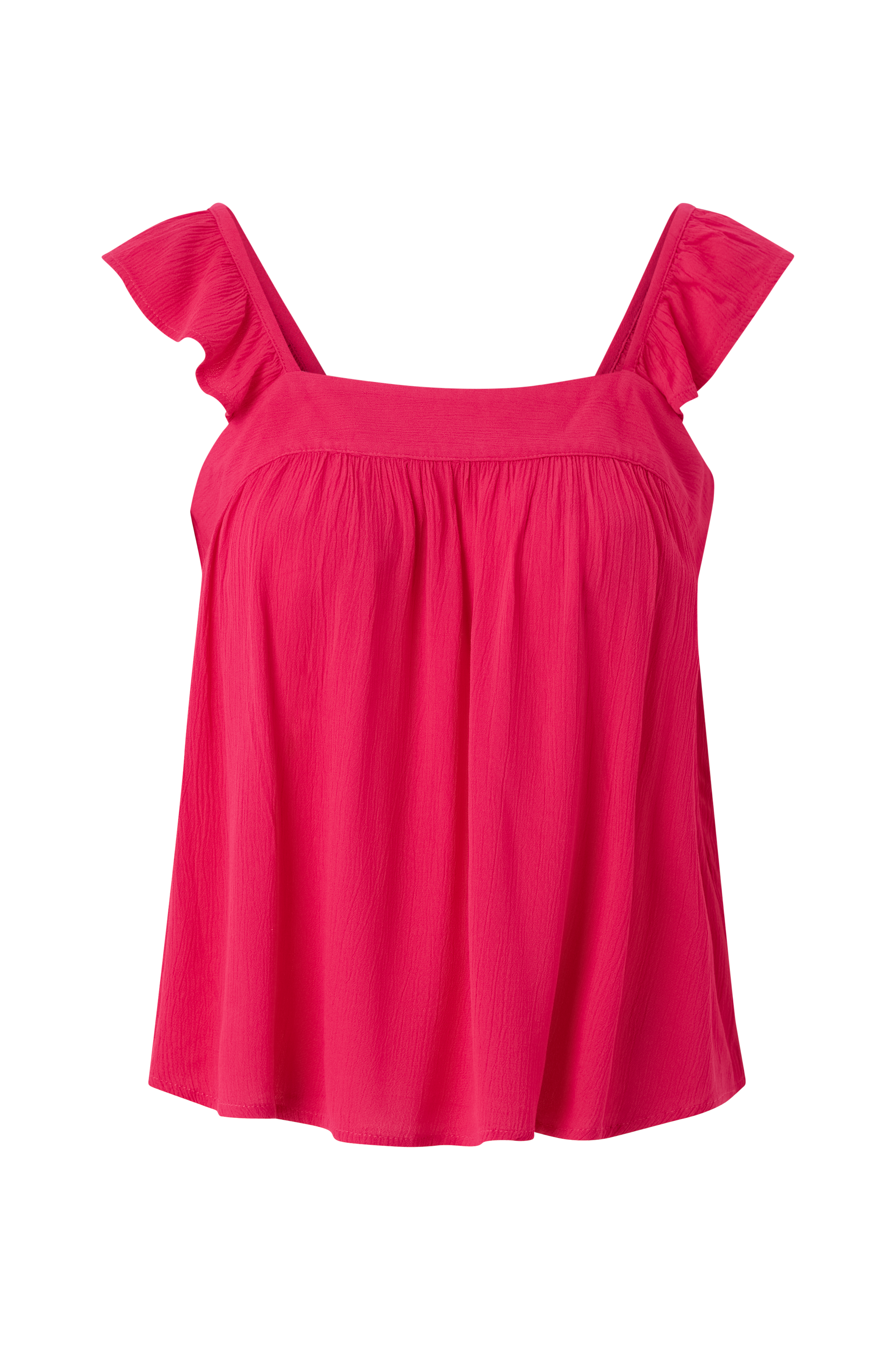 • Ærmeløs top i rynket viskose• Brede skulderstropper med volant• Snøring i ryggen