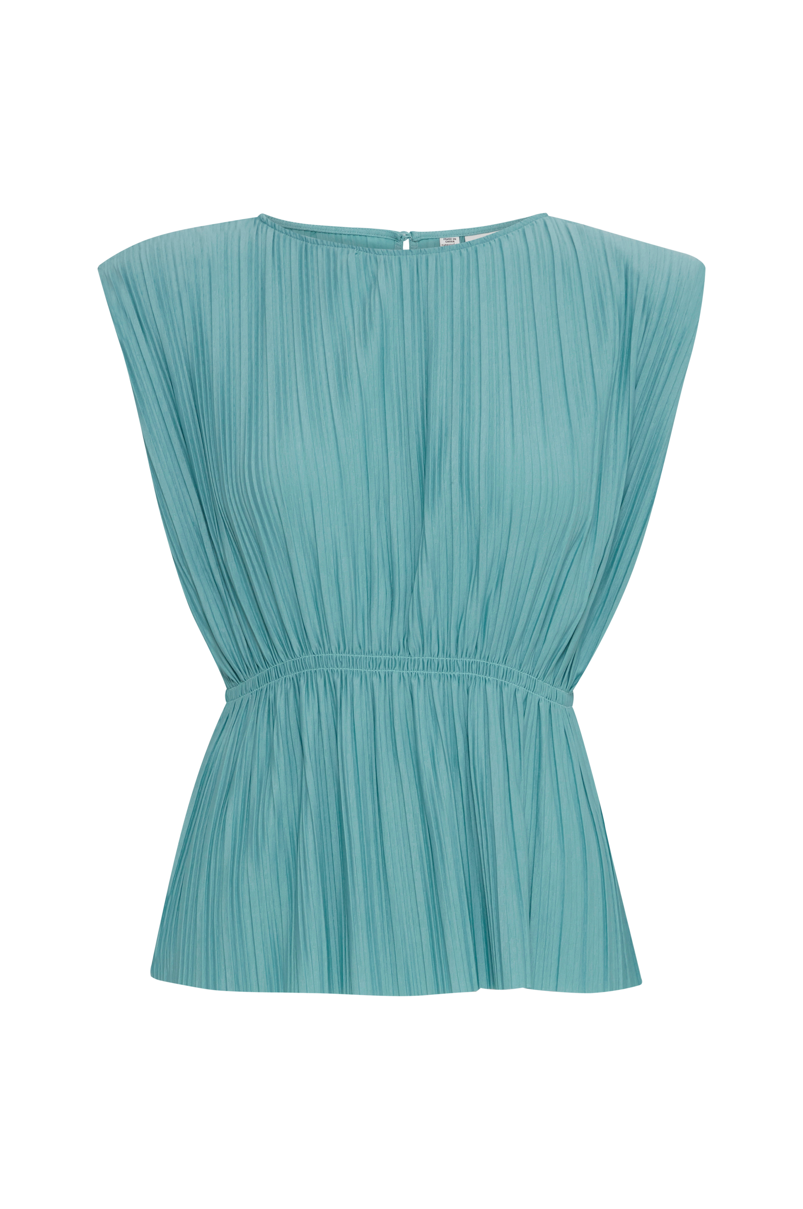 • Plisseret model• Rund hals med knap i nakken• Skulderpuder• Elastiksømme ved taljen