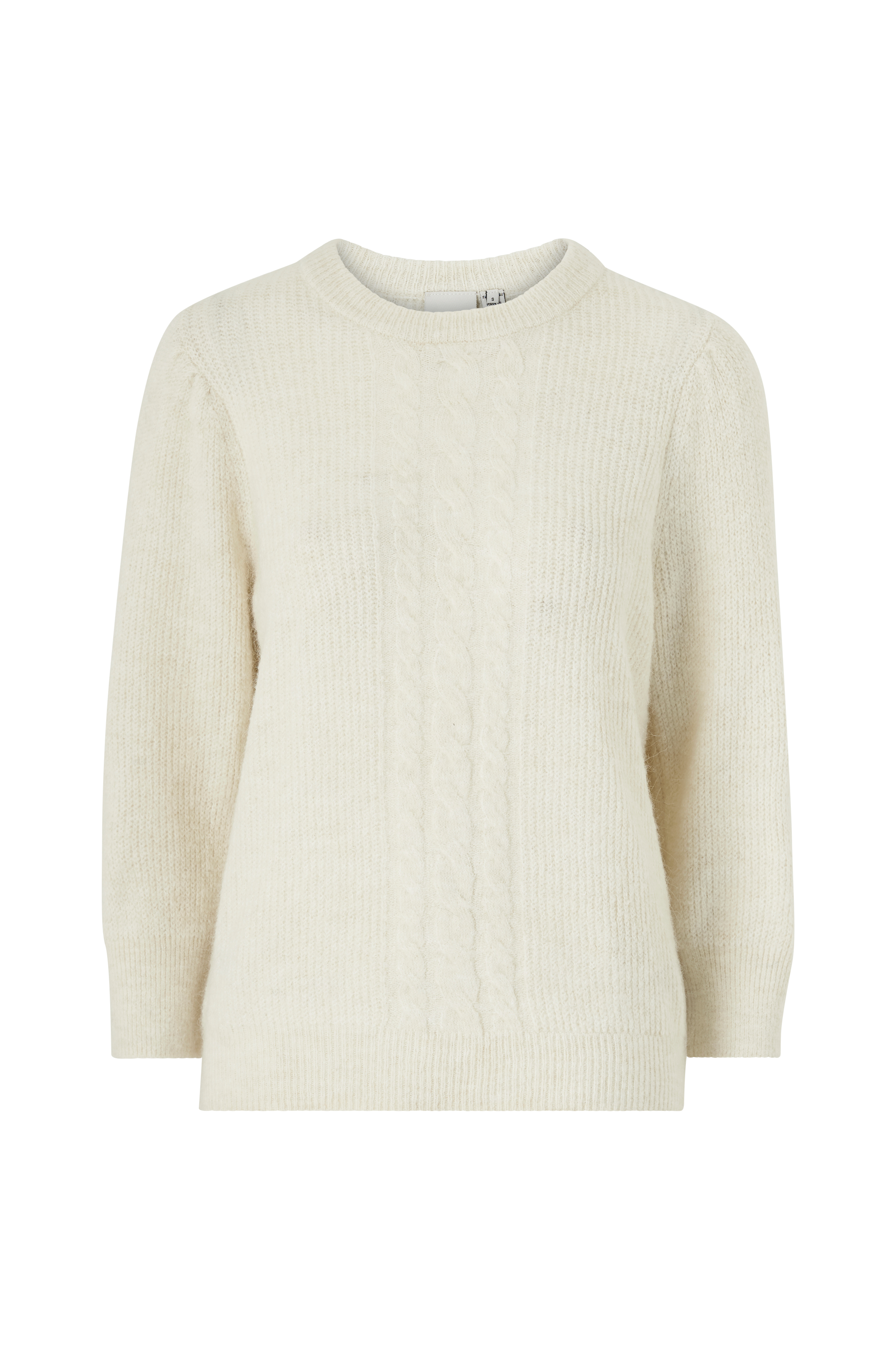 • Model med mønsterstrikning midt foran• Rund hals med ribkant• 3/4 langt ærme• Ribstrik nederst og ved manchetterne