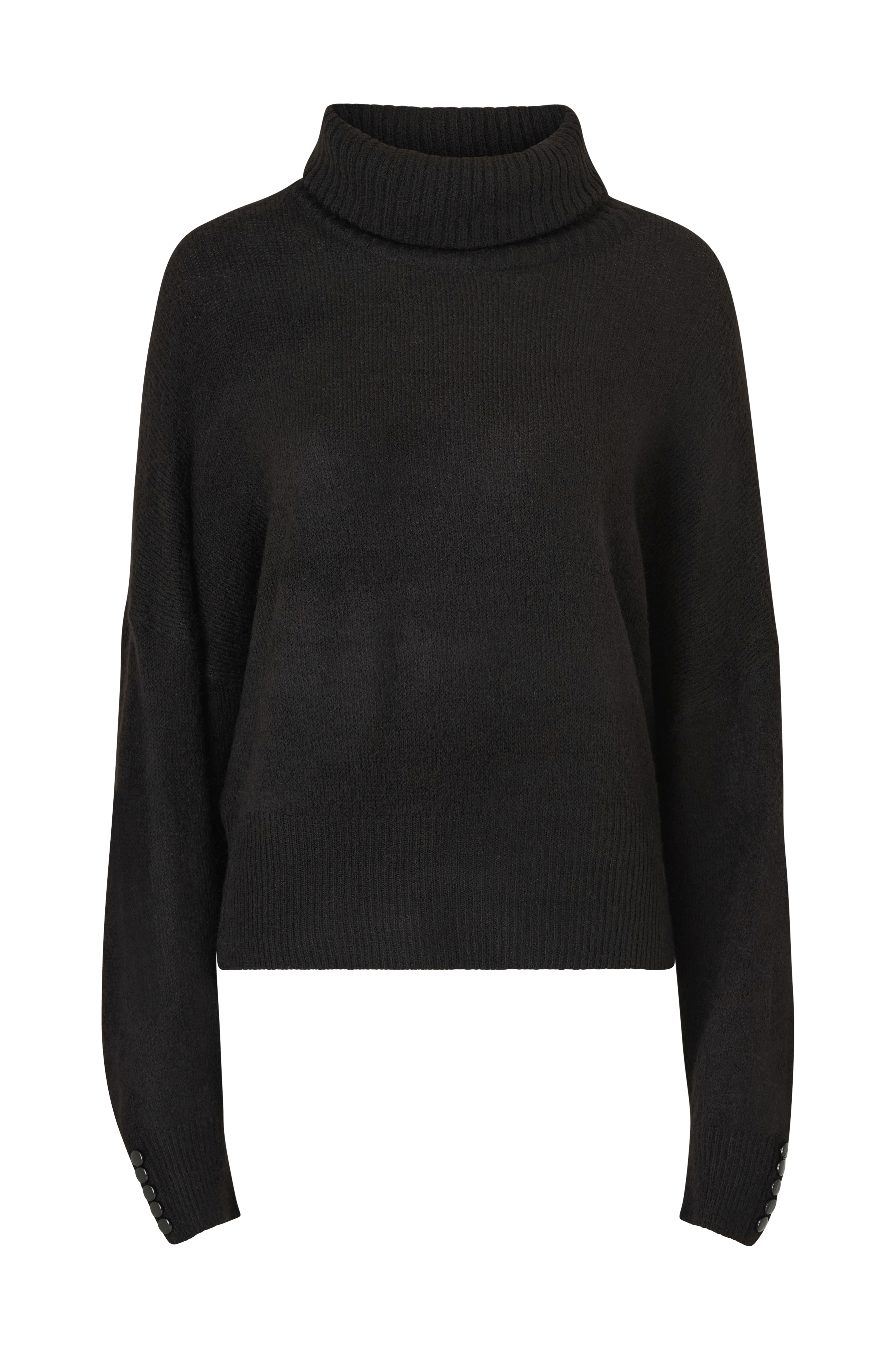 • Bred, glatstrikket model• Høj, ribstrikket krave• Nedsænket skulder• Langt ærme med ribstrik og dekorationsknapper ved manchetterne• Bred ribstrik nederst