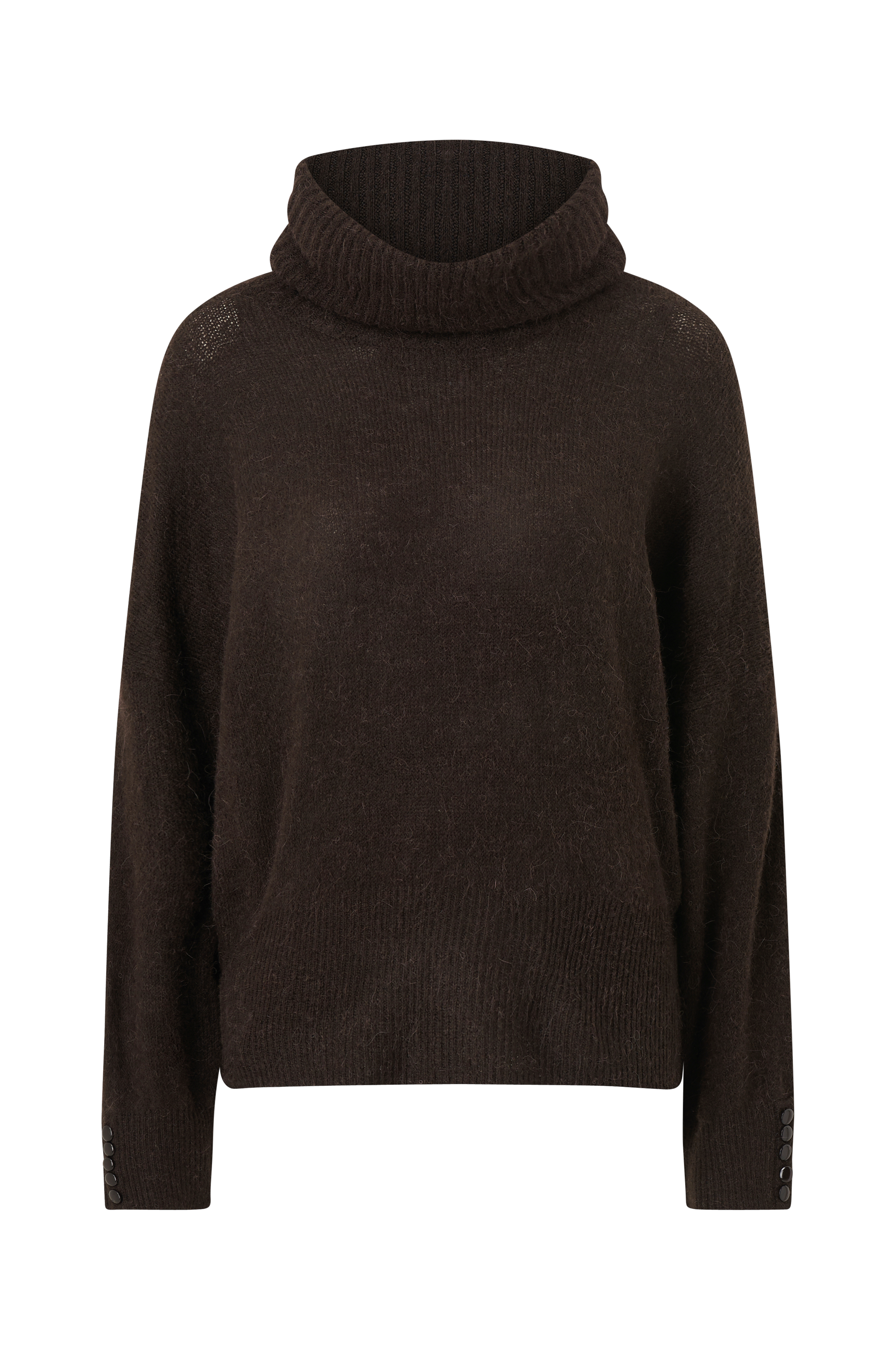 • Bred, glatstrikket model• Høj, ribstrikket krave• Nedsænket skulder• Langt ærme med ribstrik og dekorationsknapper ved manchetterne• Bred ribstrik nederst