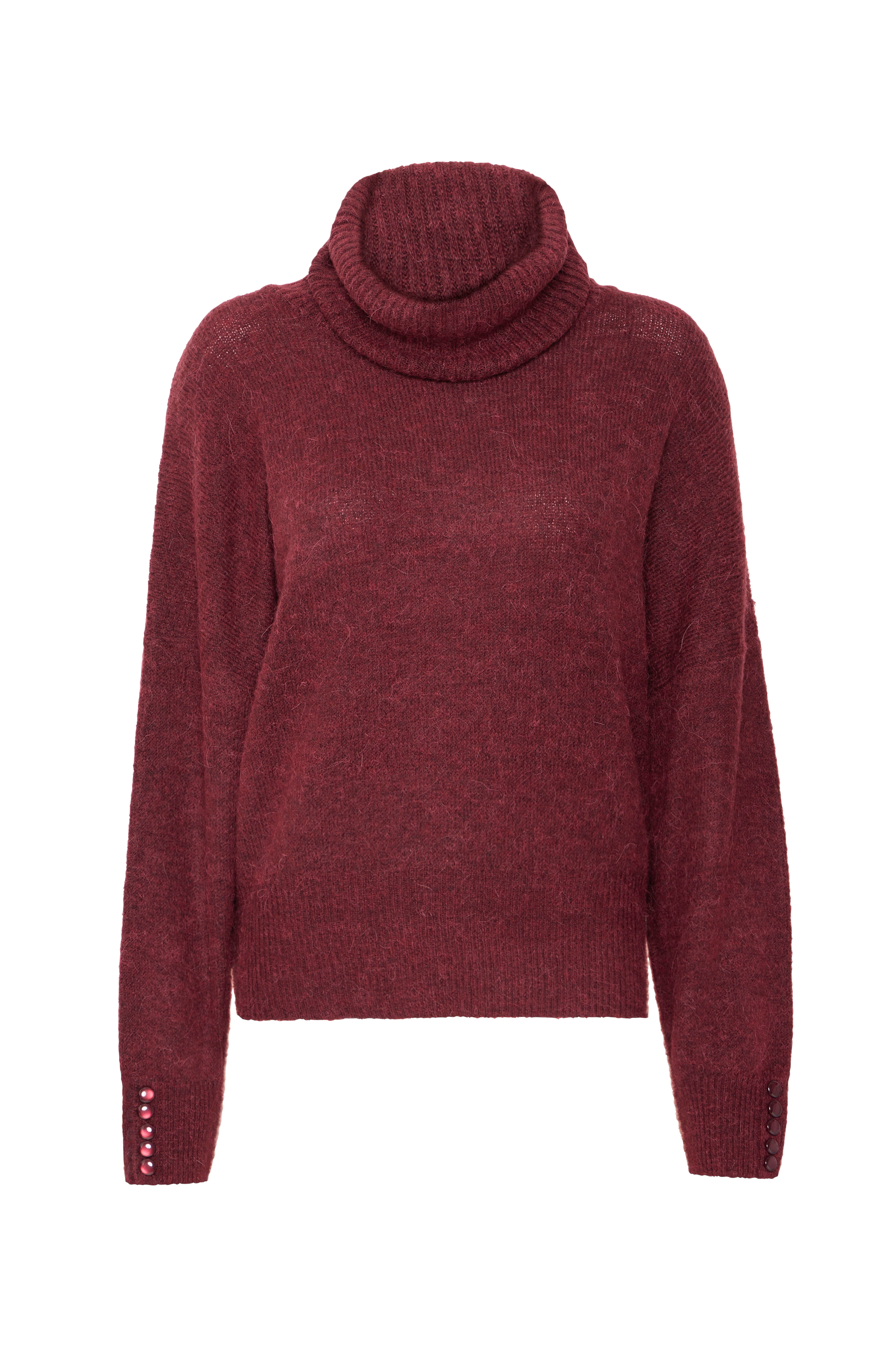 • Bred, glatstrikket model• Høj, ribstrikket krave• Nedsænket skulder• Langt ærme med ribstrik og dekorationsknapper ved manchetterne• Bred ribstrik nederst