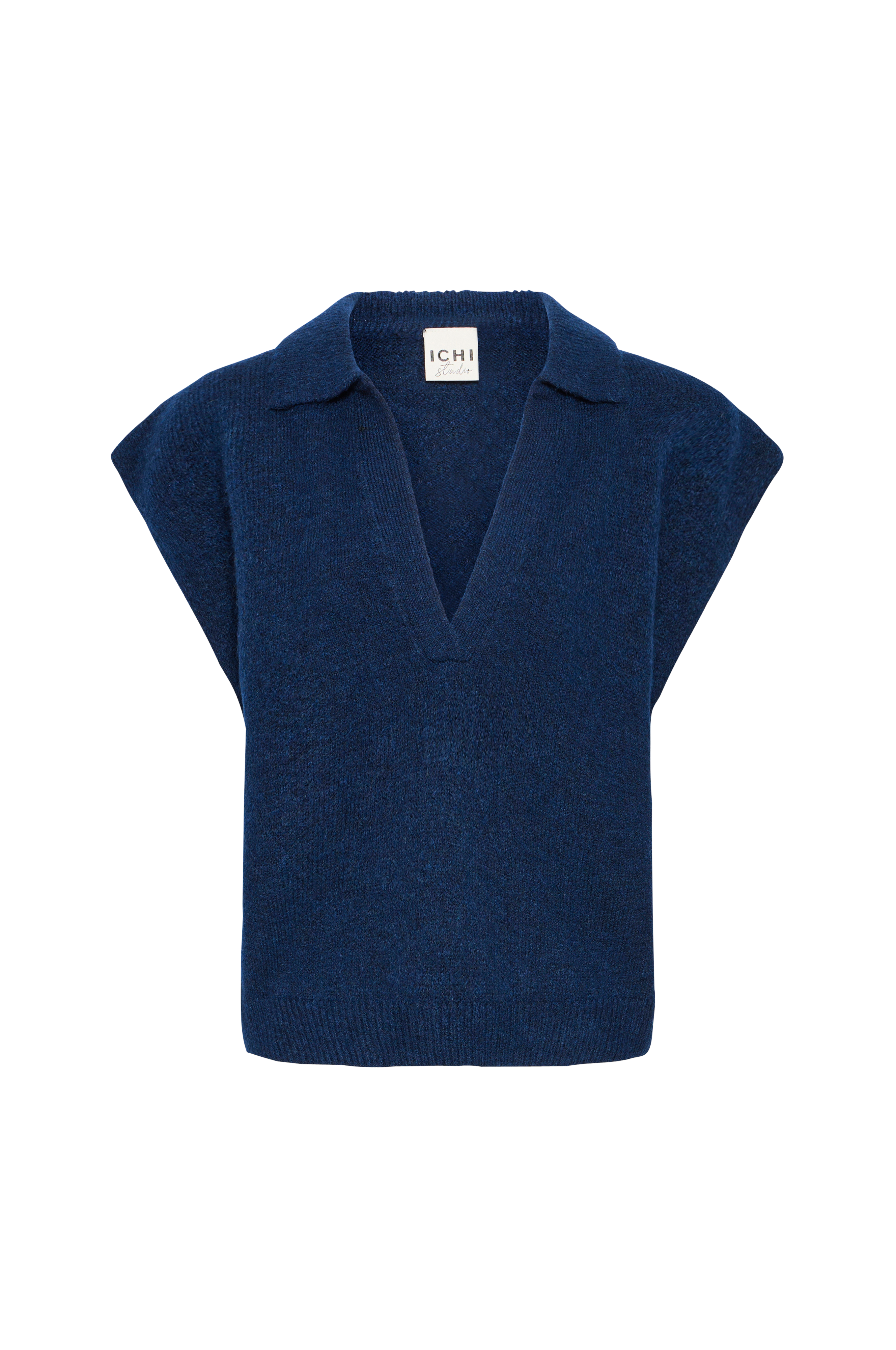 • Fintstrikket vest med ribbet krave• V-formet halsudskæring• Ribstrik ved nederste kant