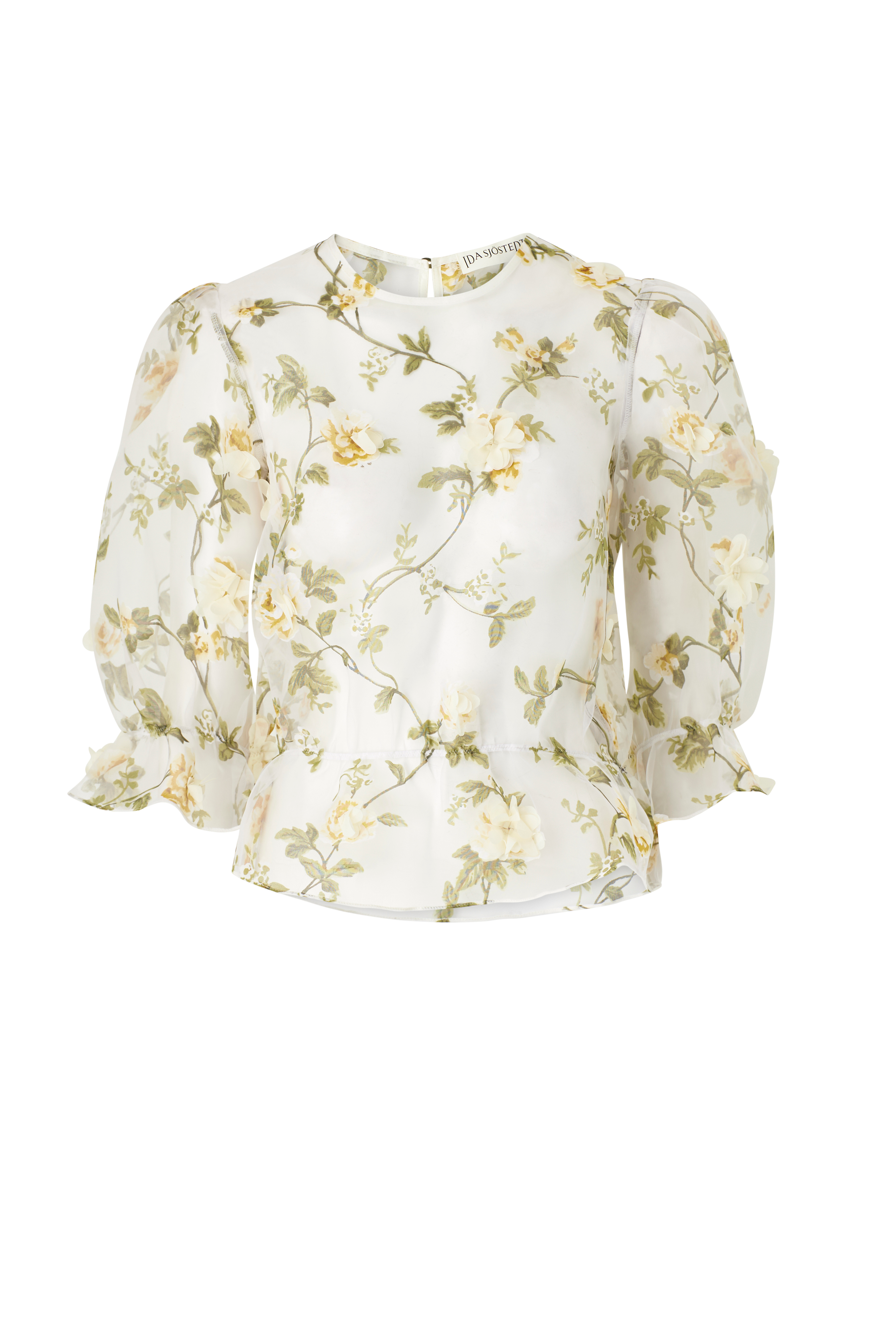 • Transparent bluse i organza med 3D-blomster i tekstil