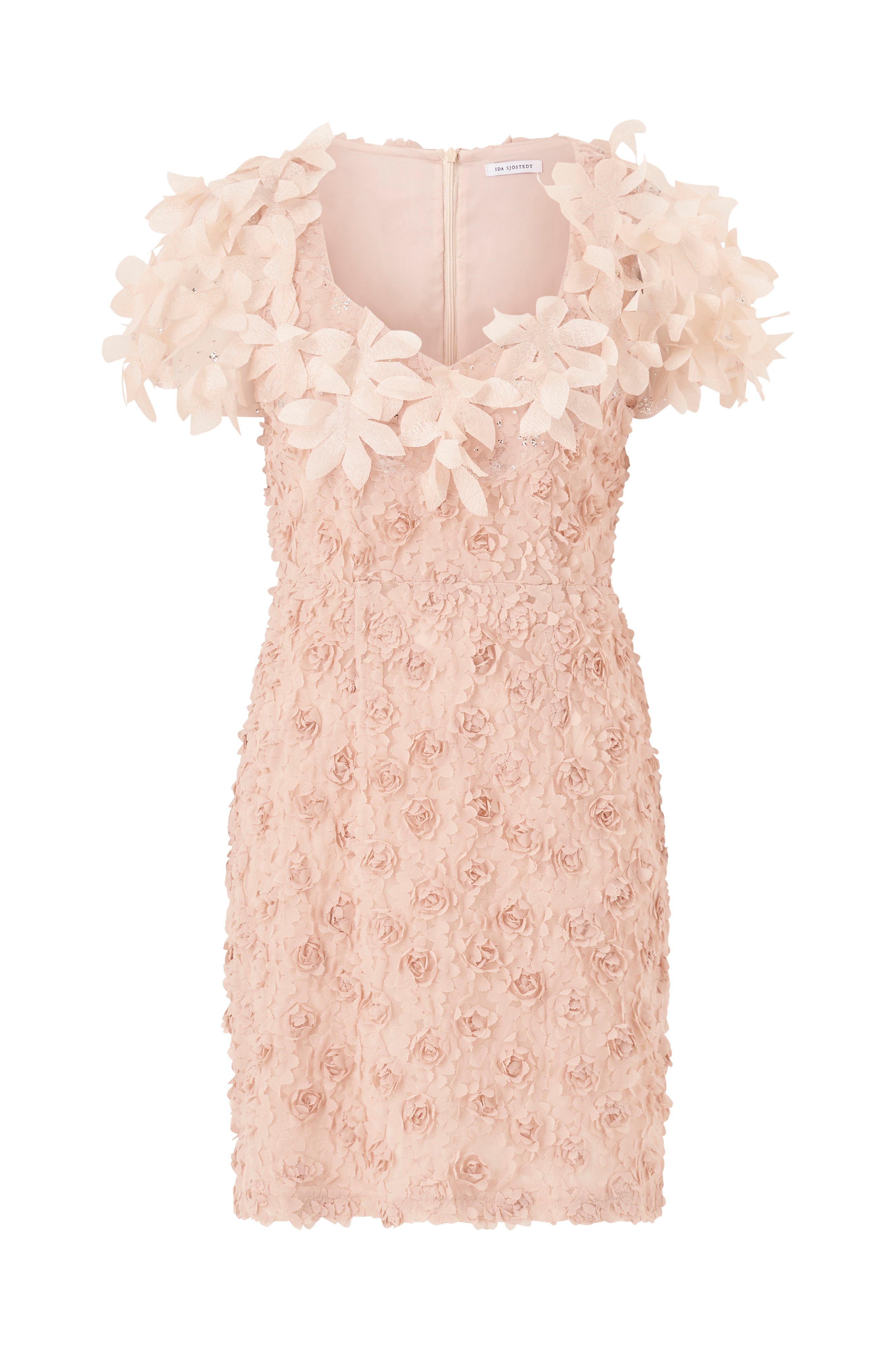 Kort festkjole i smal, kropsnær model i mesh med 3D-blomster. V-udskæring og skjult lynlås i ryggen. Korte ærmer i mesh med tekstildekorationer. Foret. Længde ca. 85 cm i str. 36.