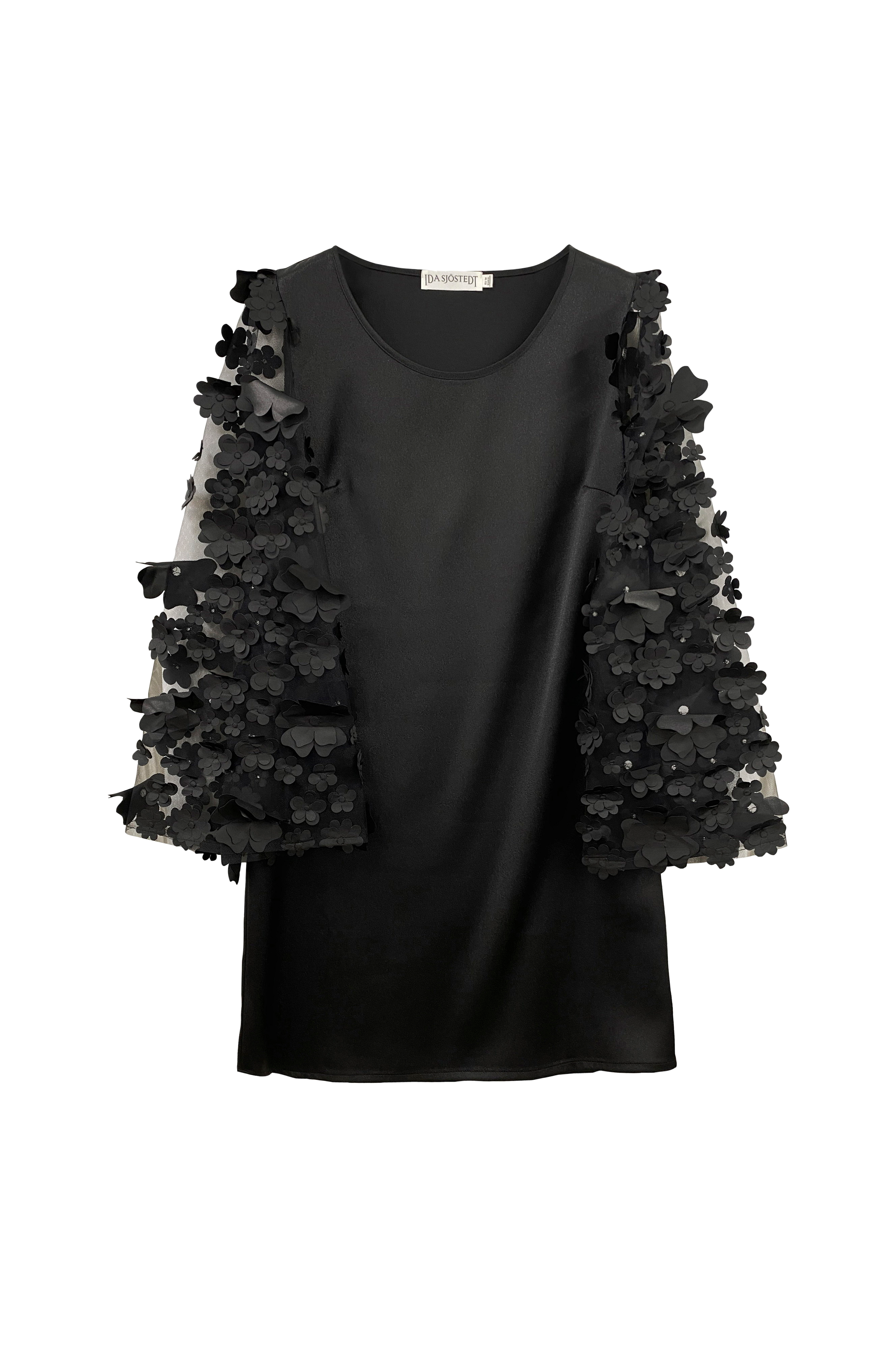 • Bredt ærme med svaj i mesh med blomstrede applikationer