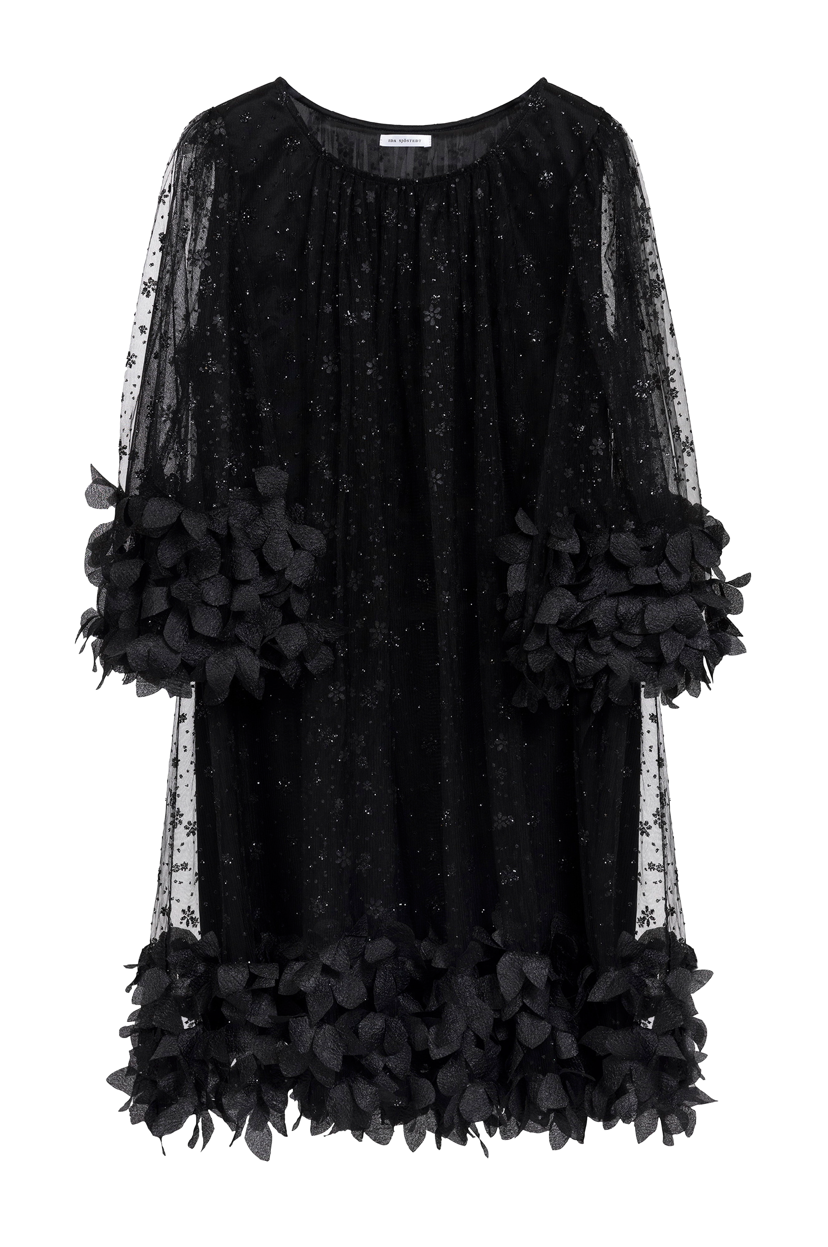 • Kort, foret kjole i mesh med blomsterapplikationer hele vejen rundt• Rund halsudskæring• Uforede ærmer med svaj• Model med svaj• Dekorative blomsterdetaljer ved manchetterne og ved nederste kant• Længde: 88 cm i størrelse 36