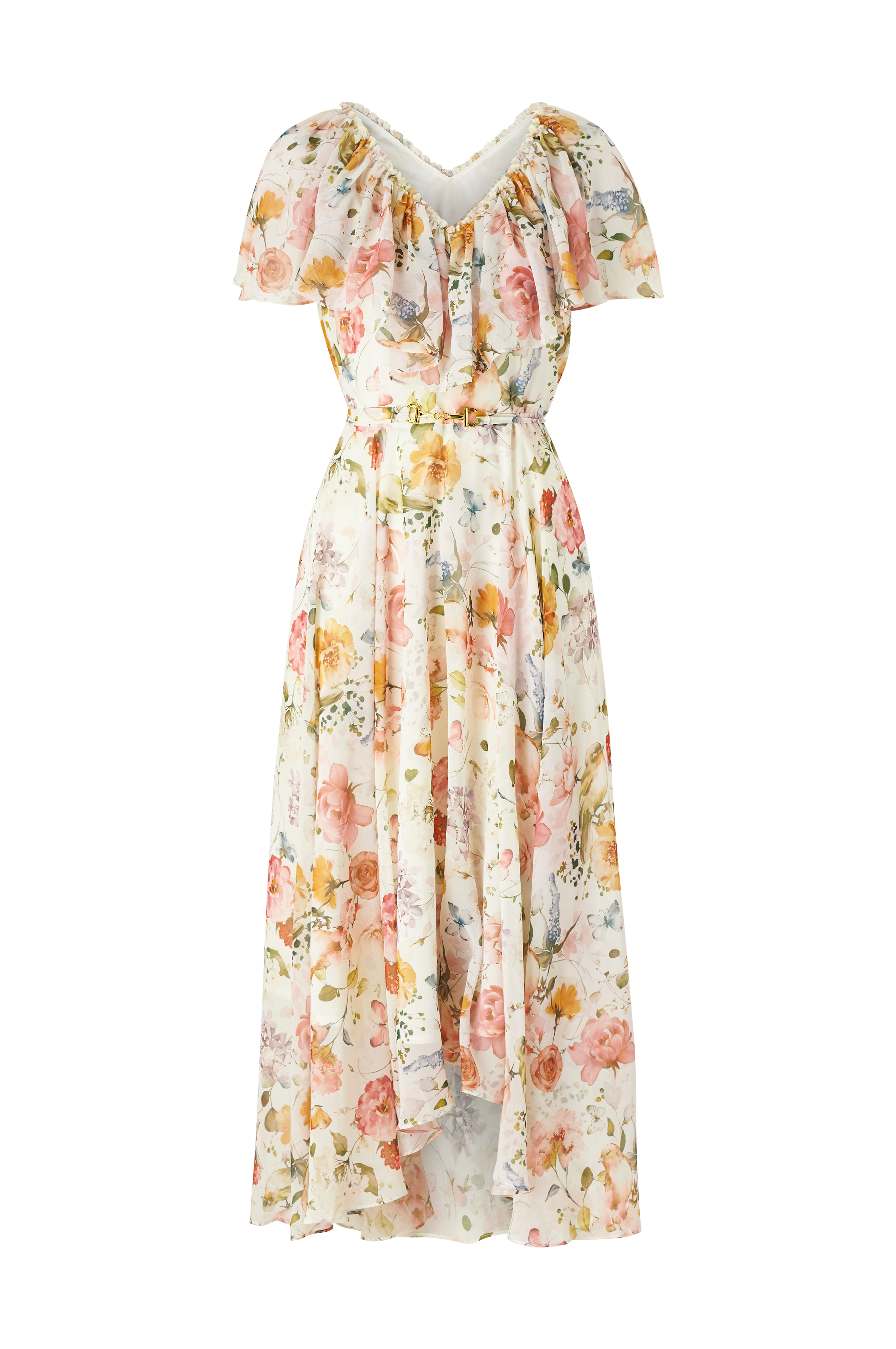 • Lang, flagrende kjole• V-udskæring med volant foran og bagpå• Tyndt bælte i tekstil• Foret• Længde: 135 cm i størrelse 36