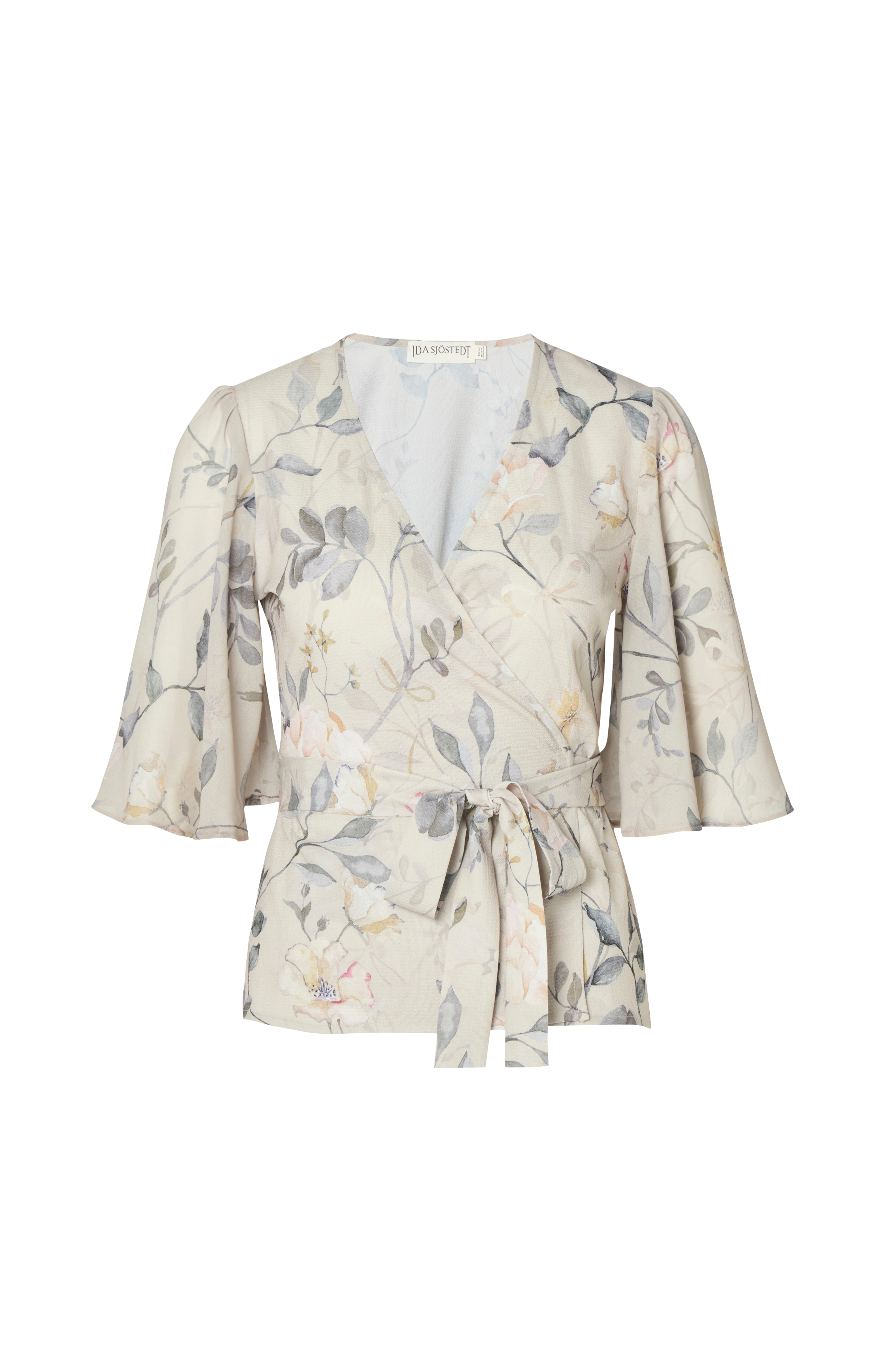 • Overpaningsmodel med bindebånd• V-formet halsudskæring• Korte sommerfugleærmer