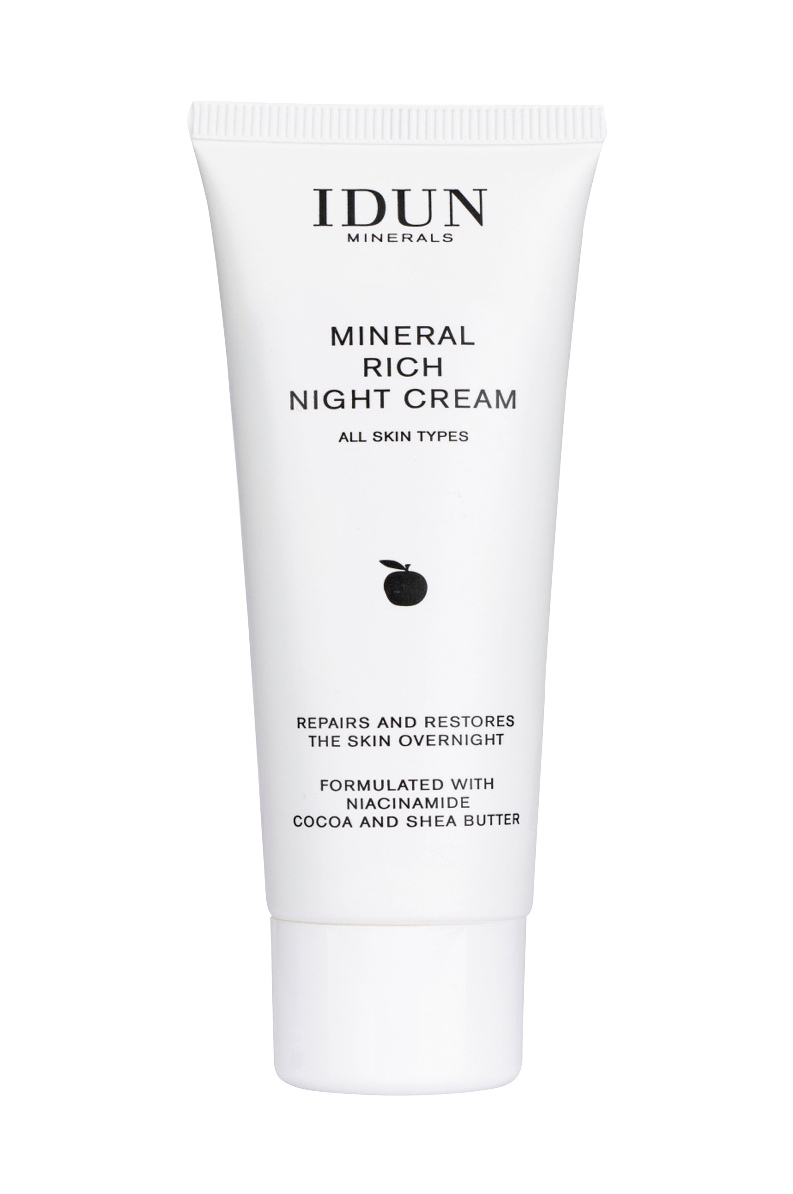 En rig og blødgørende natcreme som indeholder plejende olier fra raps, som er rig på naturlig E-vitamin samt havreolie med et højt indehold af flerumættede fedtsyrer, som er nødvendige for hudens funktion. En kombination af kakao og shea butter bidrager til at huden bliver blød og glat, så den restituerer, mens du sover.