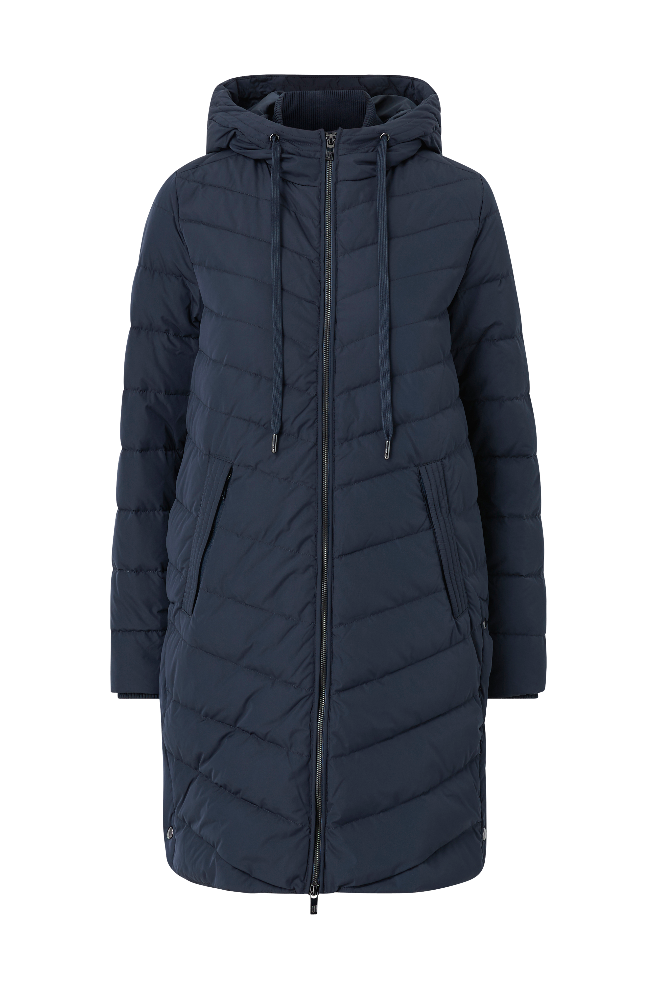 Dunfrakke Peppy01 fra Ilse Jacobsen. Varm, quiltet model med 2-vejslynlås og høj krave samt indvendig ribstrikket krave. Også indvendig ribstrik i ærmekanterne og to indsatte lommer med lynlås. Høje slidser med trykknapper forneden i siderne. Længde bagpå ca. 97 cm i str. 36.