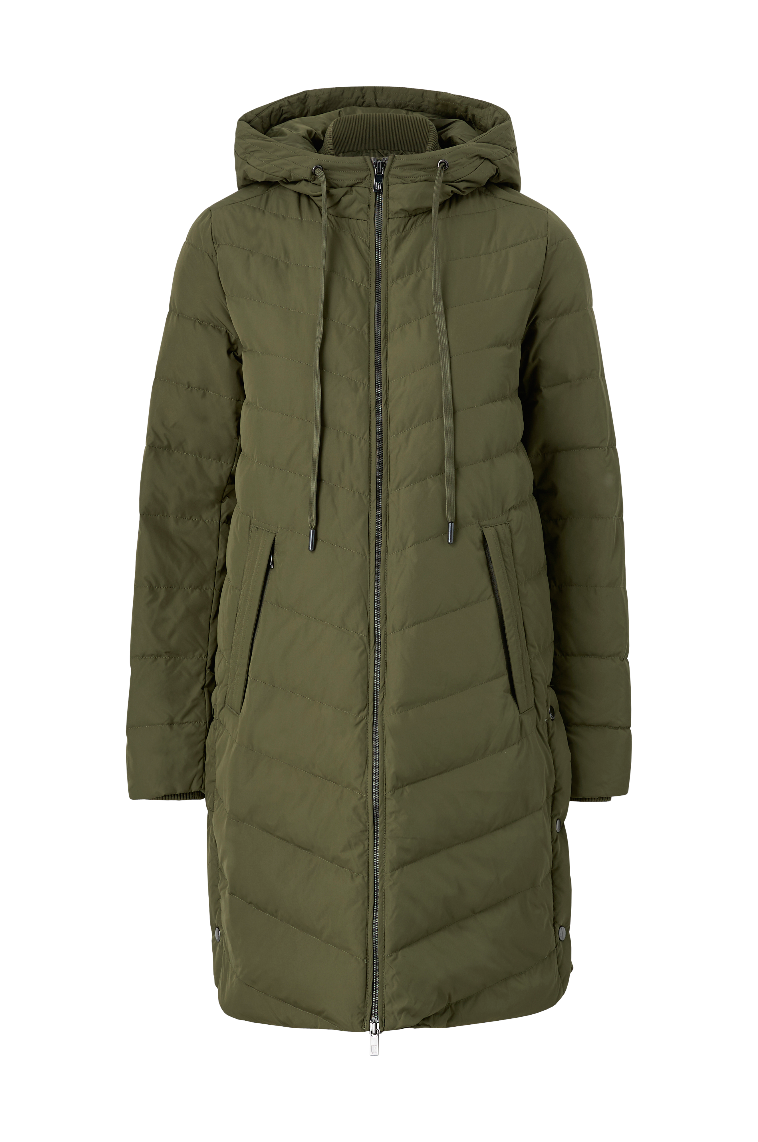 Dunfrakke Peppy01 fra Ilse Jacobsen. Varm, quiltet model med 2-vejslynlås og høj krave samt indvendig ribstrikket krave. Også indvendig ribstrik i ærmekanterne og to indsatte lommer med lynlås. Høje slidser med trykknapper forneden i siderne. Længde bagpå ca. 97 cm i str. 36.