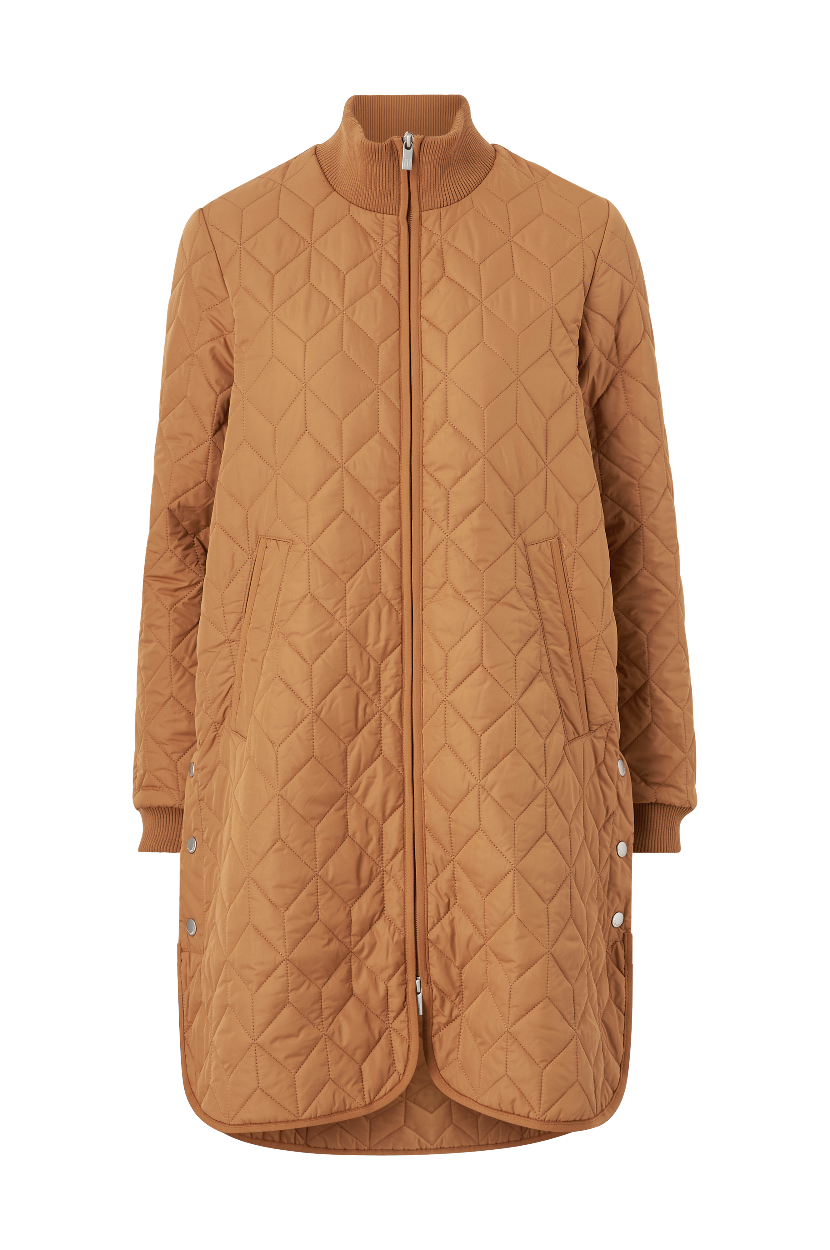 Frakke ART06 Coat fra Ilse Jacobsen. Lige model med høj, ribstrikket krave og lang, 2-vejs YKK-lynlås foran. To indsatte lommer med trykknap og ribkant i ærmekant. Afrundet forneden med elastisk kantbånd og slids med trykknapper i siderne. Længde foran ca. 93 cm og bagpå ca. 98 cm i str. 36.