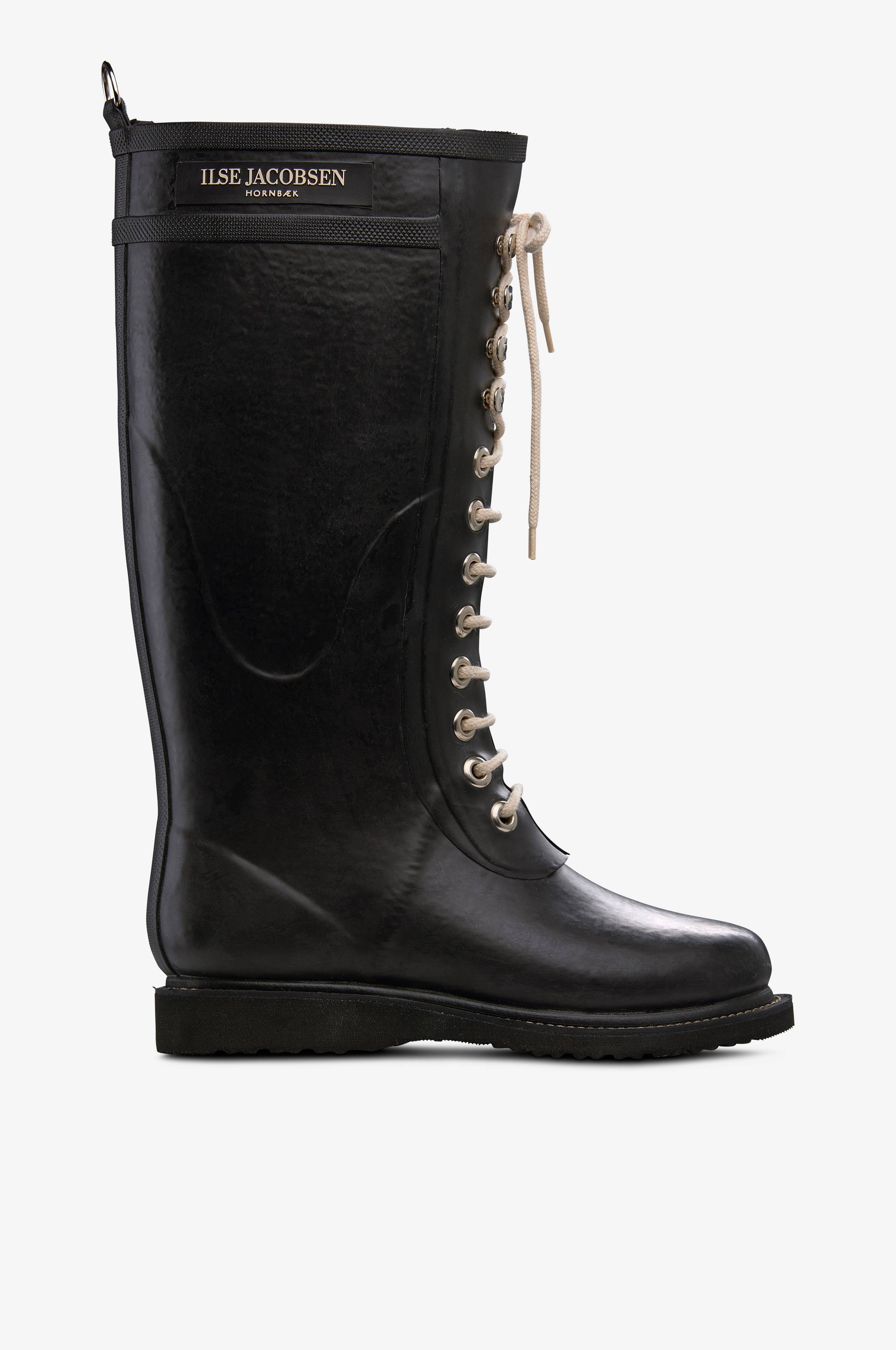 Høje, klassiske gummistøvler med snøre, fra Ilse Jacobsen, er luksuriøse og håndlavede i Europa. Snøren løber gennem sølvfarvede metalsnørehuller og hægter foroven. Skaftvidden kan justeres med snøren, bag snøren er der en hel, foldet kile. Støvlerne er fremstillet i PVC-fri gummi med blødt for. Indersålen er varmeisolerende. Flot formet ydersål i let, støddæmpende EVA med varmeisolerende egenskaber.