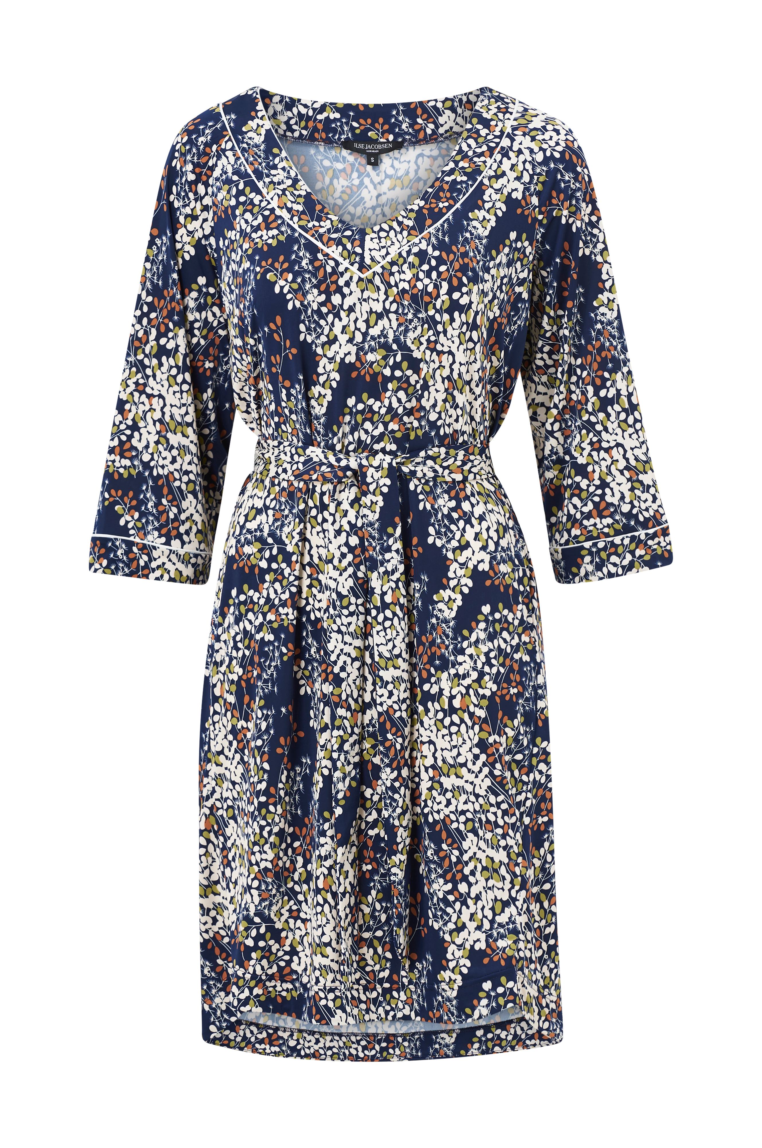 Kjole Nice 7358 Feuil fra Ilse Jacobsen i blød og smidig jersey med paspoleret kant langs halsudskæring og i ærmekant. V-udskæring foran, bindebælte i taljen og 3/4-lange ærmer. Længde ca. 99 cm i str. S.