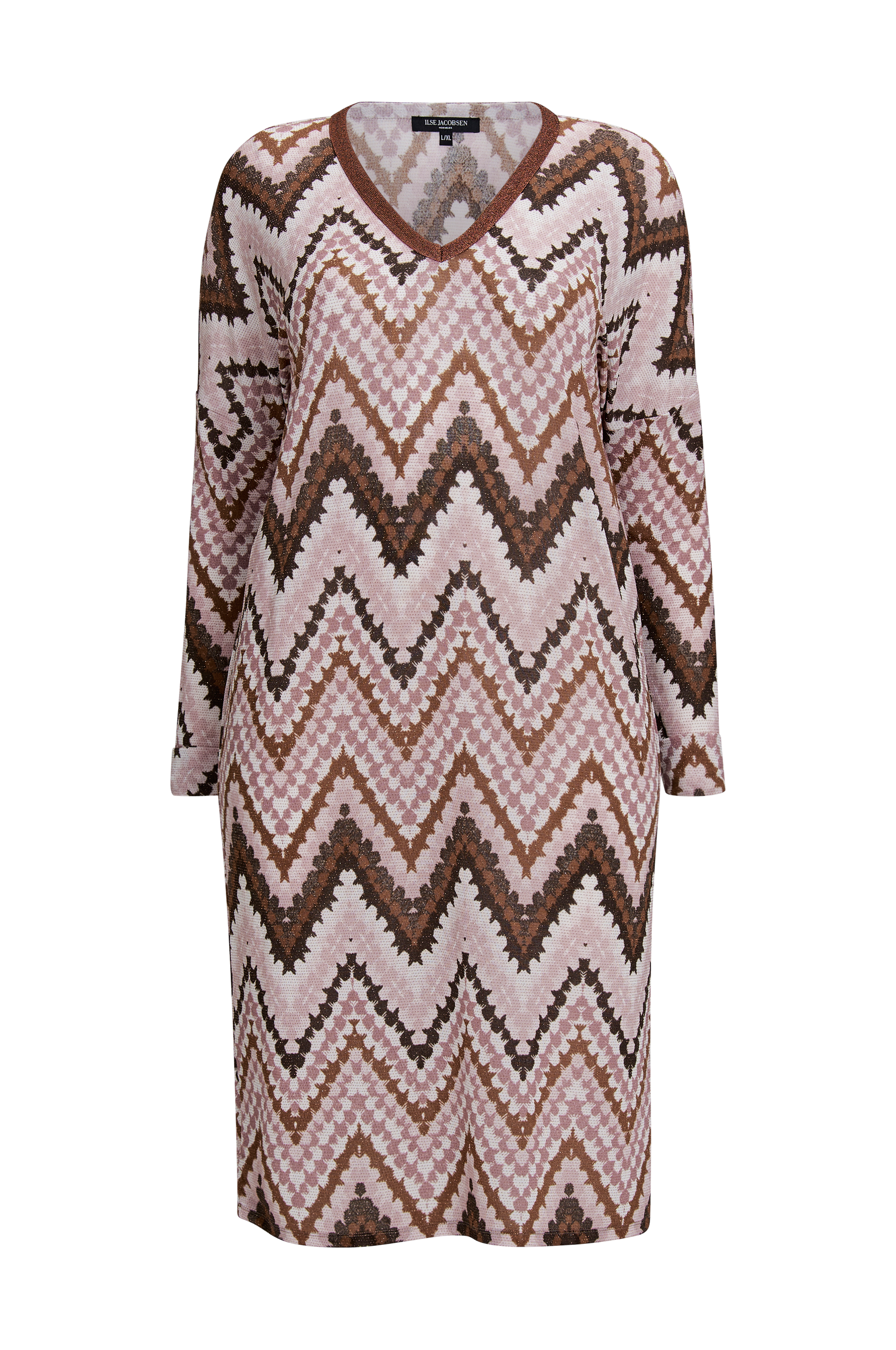 Kjole Noval238 fra Ilse Jacobsen. Flot oversizemodel med V-hals, som har ensfarvet kantbånd, og lange ærmer med faste opslag i ærmekant. Mønstret stretchjersey med indvævet glitrende tråd. Længde ca. 118 cm i str. M.