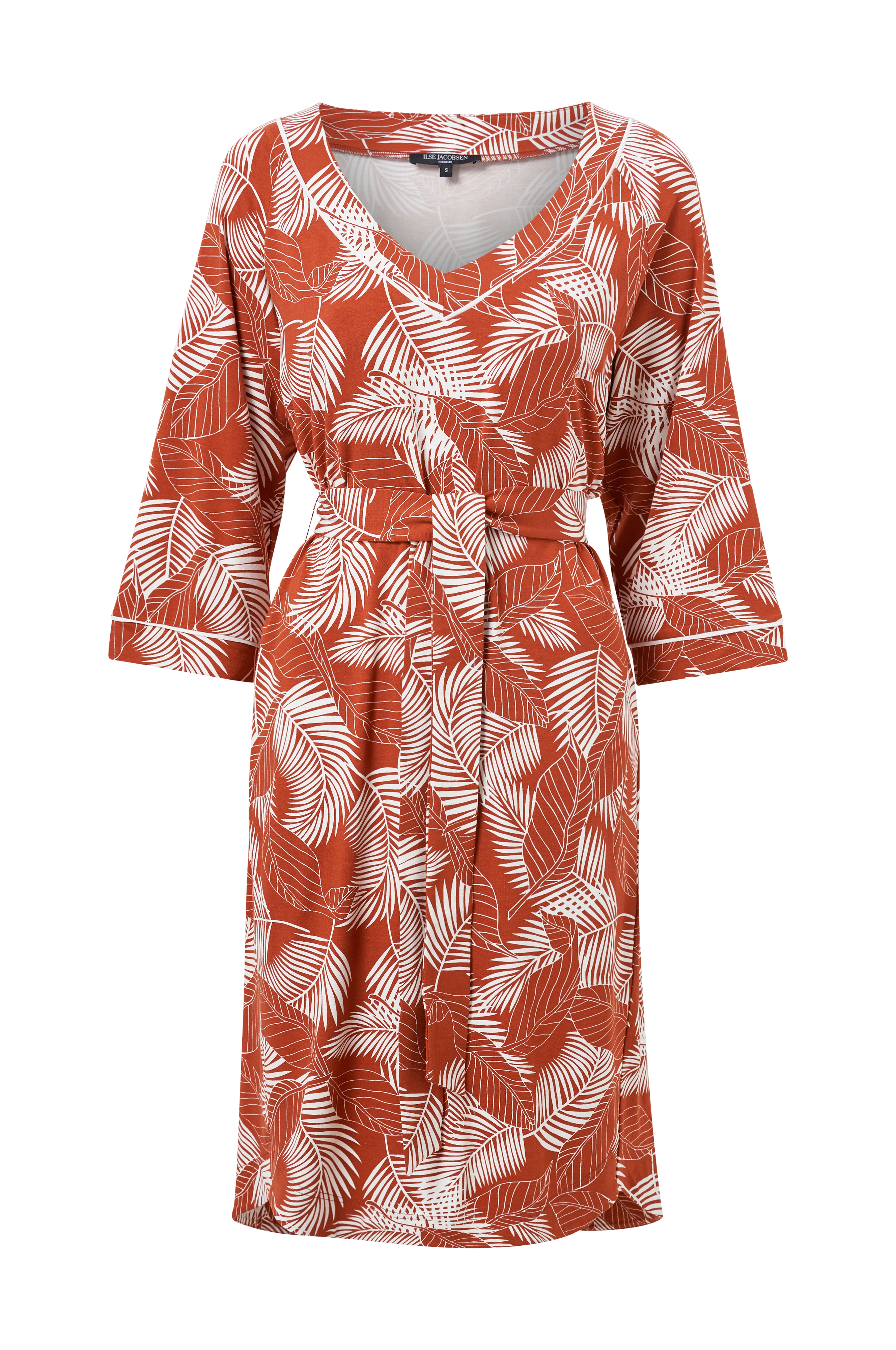 Kjole i mønstret viskosejersey med blødt fald. Lige model med bredt bindebælte i taljen. V-udskæring foran og vide, 3/4-lange ærmer. Længde ca. 106 cm i str. S.