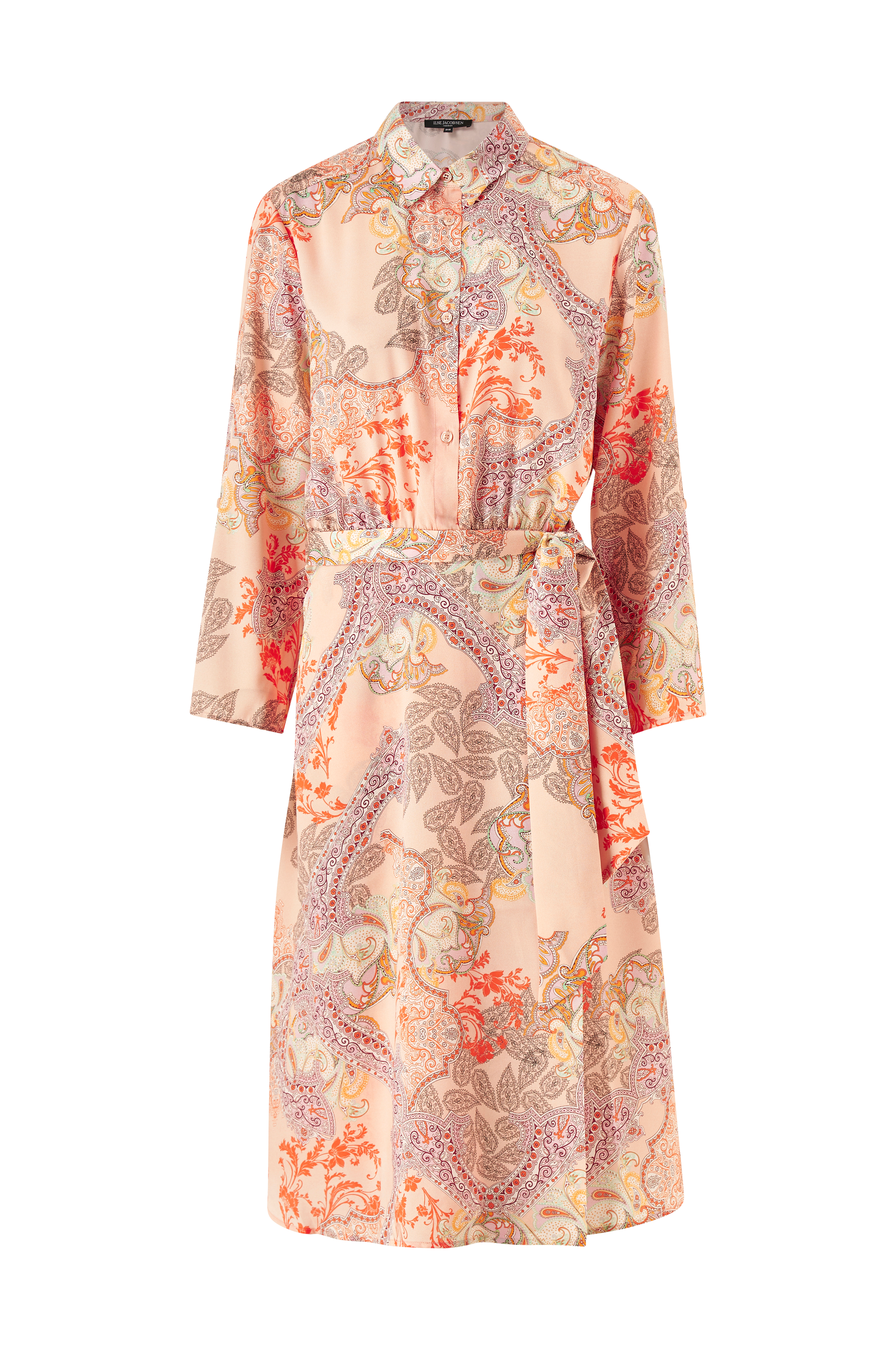 Kjole Zin7294Ley fra Ilse Jacobsen. Figursyet model med lille skjortekrave og knapkant foran ned til taljen. Markeret skulderbærestykke bagpå med lagt modgående læg samt langt, lige ærme. Afskæring hele vejen rundt i taljen med fastsyet bindebælte foran og nederdel i slå om-stil med indvendig lukning. Vævet satin med printet mønster. Længde ca. 118 cm i str. 36.
