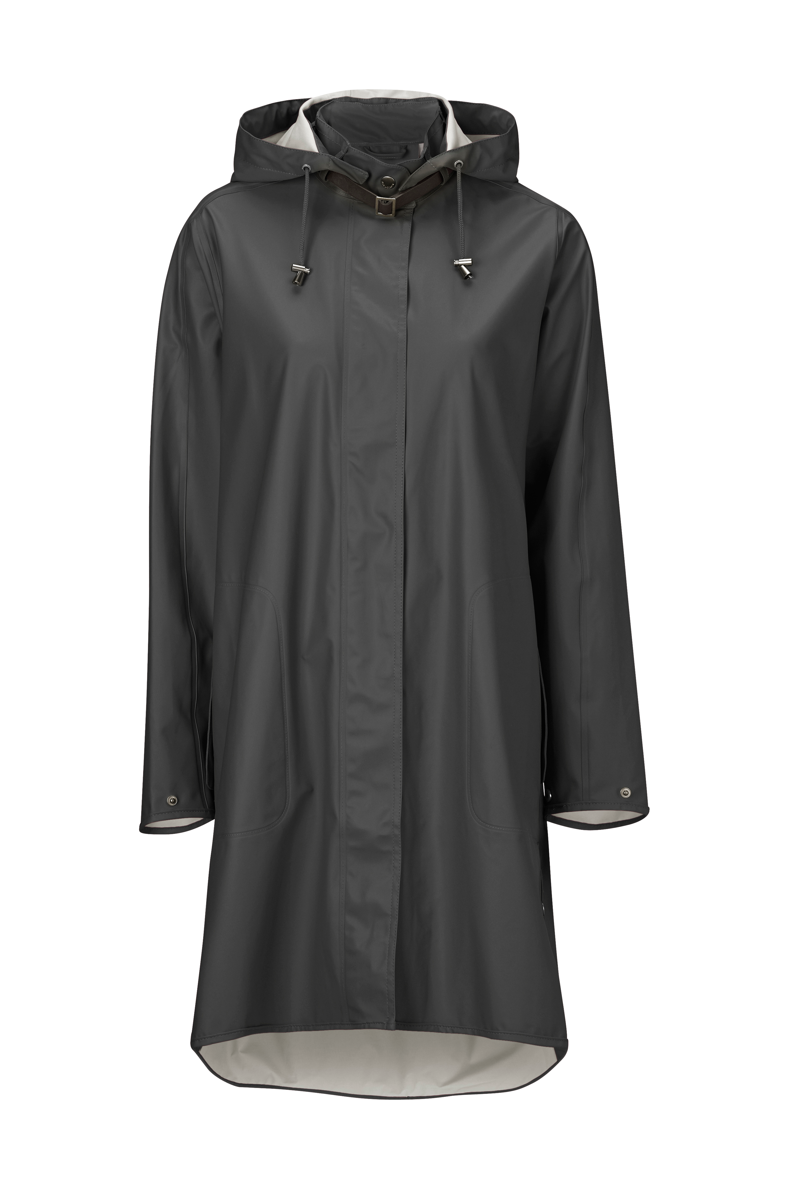 Regnfrakke Rain71 fra Ilse Jacobsen. Let A-formet model med stolpelukning som har skjult 2-vejslynlås (YKK) og trykknapper samt høj krave med knaptamp foran. Aftagelig hætte med løbegang og stop og to store, indsatte lommer i siderne. Justerbar ærmekant med trykknap og afrundet kant forneden med længere bagstykke og slids med trykknapper i siderne. Længde foran ca. 93 cm og bagpå ca. 103 cm i str. M.